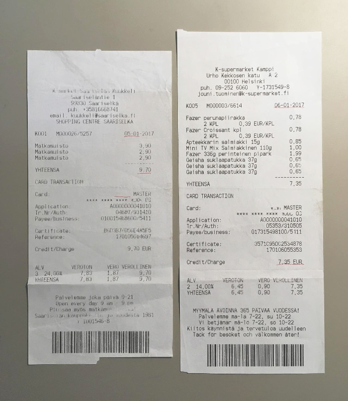 현금이 필요하면 ATM에서 카드로 쉽게 인출할 수 있다. Otto라는 주황색 간판의 현금인출기에 가서 체크카드를 넣고, 은행에서 사용하는 4자리 비밀번호를 PIN Code로 입력하면 바로 인출할 수 있었다. 처음에는 현금인출이 어려울 줄 알았는데, 생각보다 무척 쉬웠다. 또 독일이나 오스트리아, 일본 같은 많은 나라에서는 카드 사용이 안 되는 가게가 많지만, 핀란드에서는 어디에서나 카드를 쓸 수 있다. 한 번은 오스트리아에 여행을 갔다가 한 카페에서 카드로 결제하려고 보니 현금만 받는다고 하여, 함께 있던 친구에게 돈을 빌려서 내기도 했다. 친구가 없었다면, 어떻게 돈을 냈을까 싶다. 하지만 핀란드에서는 우리나라에서 만큼 어디에서나 카드로 지불할 수 있으니 걱정하지 않아도 된다. 그래서 핀란드에 갈 때는 현금을 많이 챙겨갈 필요가 없다.
