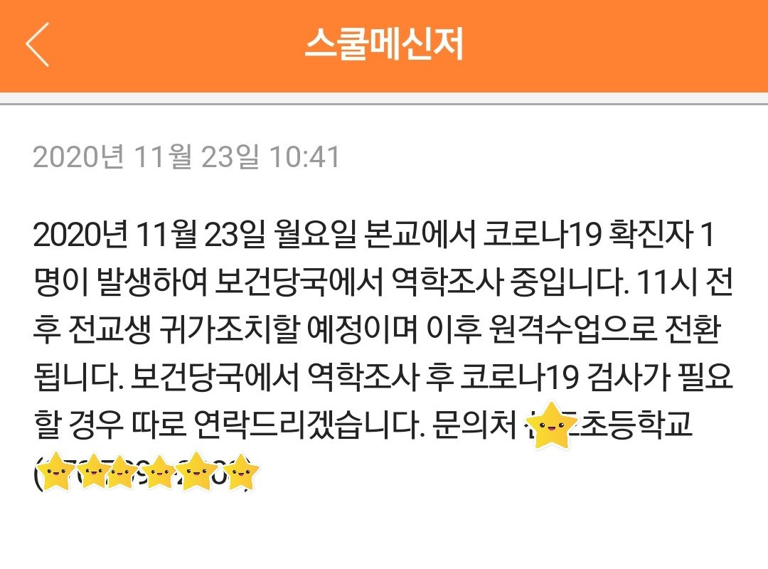 그리고 오늘 나에게 청천벽력과 같은 일이 일어났다. 아침에 짱구가 등교를 하고 하교 시간까지 빡빡한 스케줄을 소화하고 있던 중 갑자기 핸드폰 알람이 울린다. 다시 코로나 3차 대유행이라 할 만큼 연일 확진자가 급증을 하고 내가 살고 있는 지역에도 어제만 23명의 코로나 환자가 발생했다. 불안한 마음에 아침에 학교를 보내야 하나 고민하다 학교에서 별다른 공지가 없으니 일단 보냈는데 짱구가 다니는 학교에도 확진자가 발생해서 2교시 마치고 귀가 조치시킨다는 문자였다.