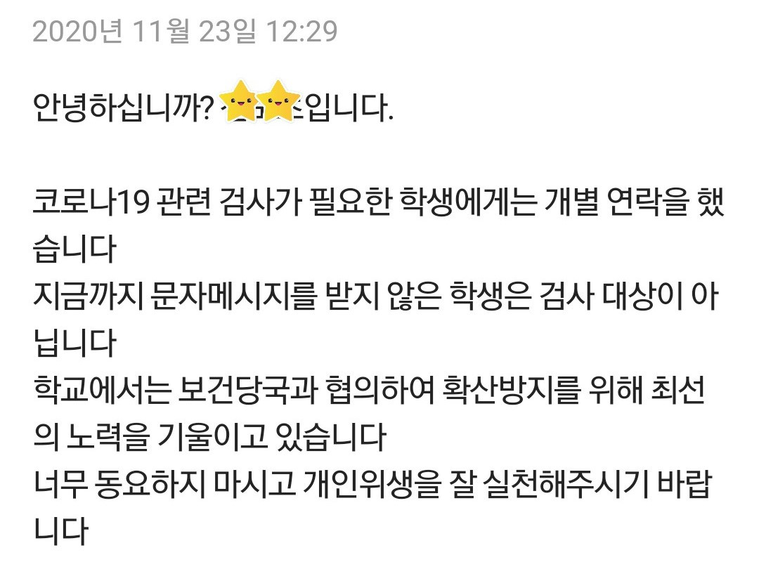 한참을 진정하고 나니 '오늘은 좀 쉬어야겠어'하더니 언제 그랬냐는 듯 노는 짱구를 보며 아직은 아이구나 싶으면서도 혹시나 싶어 걱정이 되는데 학교에서 다시 한번 검사 대상 학생과 교직원들은 모두 검사를 완료했고 학교도 두 차례에 걸쳐 소독을 완료했다는 문자를 확인하고서야 놀란 가슴을 쓸어내린다.