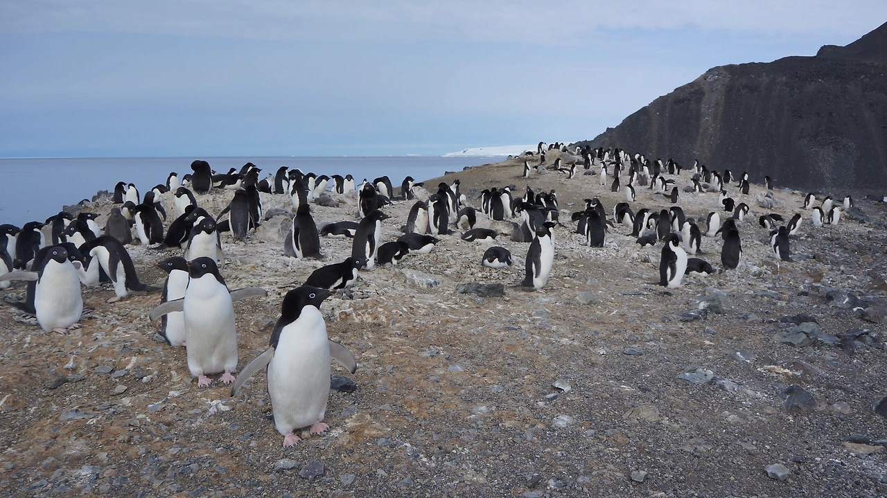 ▲ 아델리펭귄 서식지 집단 서식을 통해 천적으로부터 방어를 한다. 무리의 주변에 경비를 서고 있는 펭귄들