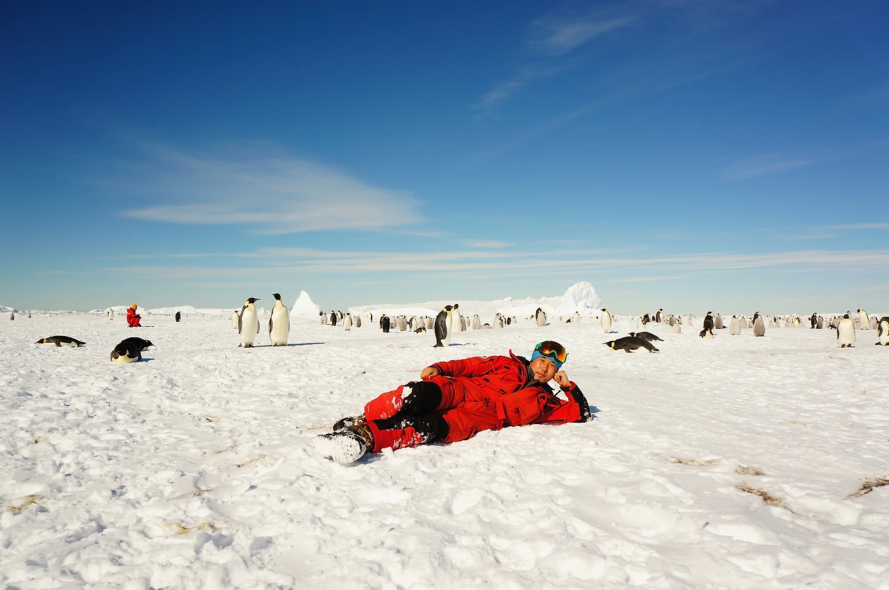 마을의 손님이 되었다. 눈 위에 누워 사진도 찍어 보고 주변을 거닐어 본다. 황제 펭귄의 명성답게 카메라를 의식하며 멋진 포즈를 잡는다. 연신 물개박수를 치는 아기 펭귄들의 반응이 뜨겁다. 친구가 되면 도망가거나 놀라지 않는다. '졸졸' 따라 다닌다.