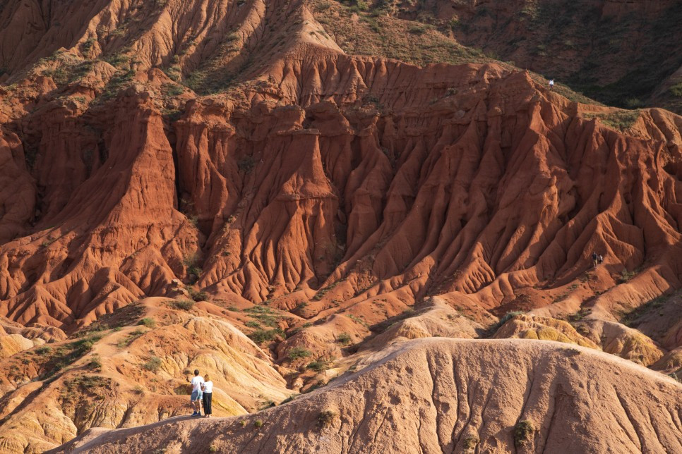 수천 년 동안 지구의 침식작용으로 자연이 만들어낸 작품이다. 전망이 있는 언덕에 오른다. 이식쿨 호수와 천산 산맥의 장엄한 파노라마를 볼 수 있다. 야외 웨딩 촬영중이다. 드론을 띄워 멋진 영상을 남긴다. 신부의 드레스가 밝은색이면 좋았을 것을. 검은색 드레스라 보는 내가 아쉽게 느껴졌다. 그래도 가장 화려하게 꾸미고 행복한 모습이 아름다워 보인다.
