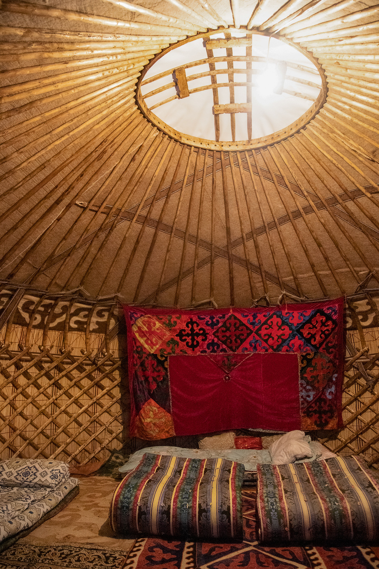 해가 떨어지니 금방 어두워진다. 작은 마트에 들러 수박을 몇 통 샀다. 큰길을 벗어나 호가로 들어간다. 과수원 나무들이 있는 한 가운데 3동의 유르트가 있다. 새로 지어서 인지 내부는 청결했다. 아버지하고 동생과 함께 직접 만들었다고 한다. 한 동을 세우는데 2개월 정도 걸렸다. 침실용에 비해 다이닝룸은 무척 크다. 천장 높이가 7미터나 된다. 10명이 함께 잘 수 있다. 바닥은 전통 카펫으로 깔았다. 침대 매트처럼 두툼함 이불이 가지런하다. 한쪽 켠엔 차를 마실 수 있는 다과 세트도 있다. 산에서 텐트 생활을 많이 해서인지 나에겐 럭셔리한 글램핑 이상이다.