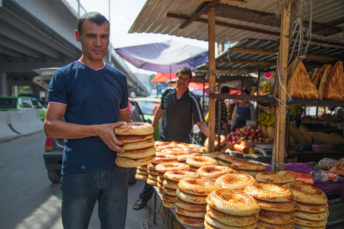 ▲ 중앙아시아 사람들의 주식 화덕에 구운 빵 '레표시카', 갓 구운 빵을 배달해 판매하고 있다.