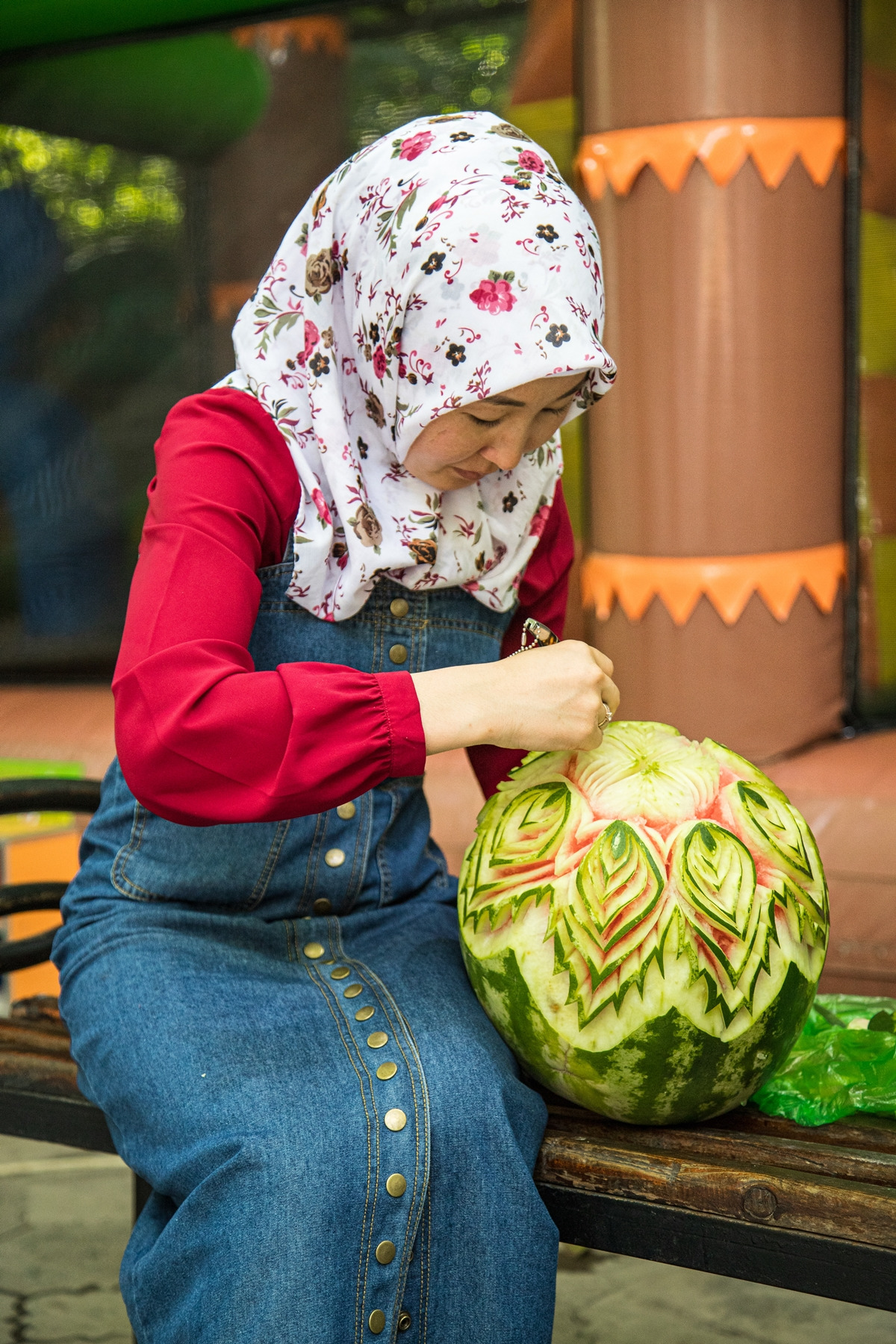 걱정했던 파미르 하이웨이가 해결되었다. 시간 지체하지 않고 떠날 수 있는 것도 다행이다. 이렇게 남자 셋. 여자 한 명이 한 팀이 되었다. 낯선 여행지에서 걷는 것을 좋아한다. 거리의 풍경, 사람들의 부산함을 보며 다른 삶의 시간을 즐긴다. 시내 중심가를 지난 바자르(시장)에 들렀다. 고가 다리 밑의 주차장은 마슈르카 터미널이라 혼잡하다. 작은 강을 따라 공원이 형성되어있다. 아이들을 위한 놀이기구, 길거리 음식, 풍부한 과일들, 다양한 즐길 거리가 모여 있다. 수박을 조각해 화려한 꽃으로 만드는 아티스트가 눈에 띈다.