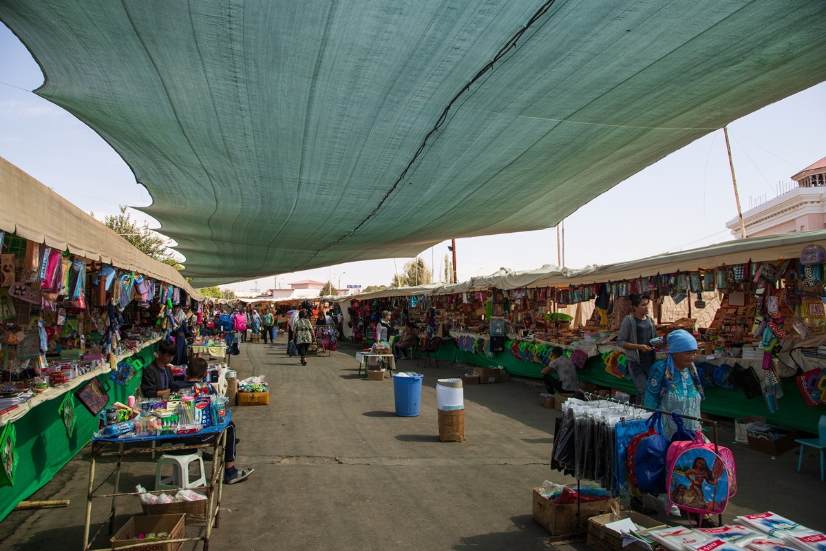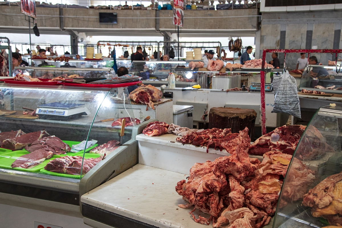 서민들의 삶을 볼 수 있는 초르수 바자르. 중앙아시아에서 가장 큰 시장이다. 큰 돔구장처럼 만든 건물이 메인 센터다. 마치 모스크를 연상시킨다. 주변으로는 물품별 구획이 나뉘어져 있다. 내부에 들어서면 높은 천장 때문에 시원한 느낌이 든다. 냉장되지 않은 생고기 정육점, 견과류, 말린 과일, 반찬 코너들이다. 김치, 오이절임, 순대. 나물무침 등 한국식 반반들과 다르지 않다. 갖은 양념에 벌건 고춧가루 색깔은 무척 매워 보인다. 현지인들에게 인기가 많다. 이것저것 시식을 해보다 저울에 계량을해서 구입한다.