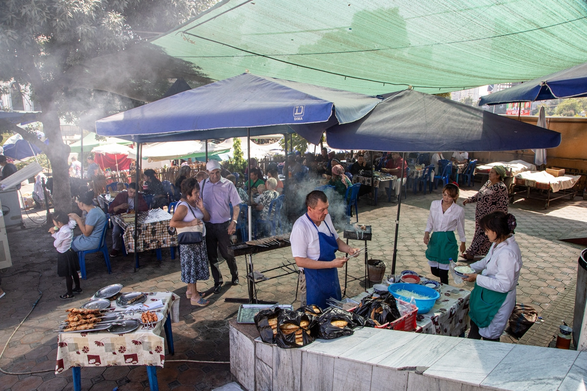 건물 외부로 나가면 없는게 없다. 품목별로 섹션이 나뉜다. 세상의 모든 과일을 모은 청과물, 실크로드를 상징하는 문양의 그릇들, 후각을 자극하는 향신료... 없는게 없다. 차양으로 하늘을 가렸다. 햇빛은 뜨거워도 그늘에 들어서면 시원하다. 양고기 굽는 냄새가 진동한다. 맛집 이다. 야외 테이블에 사람들이 꽉 찼다. 자리에 않으면 주문은 자동이다. 모두들 샤슬릭(바비큐)을 먹는다. 양고기, 치킨. 이름모를 내장 꼬치들을 숯불에 잘 구워낸다.