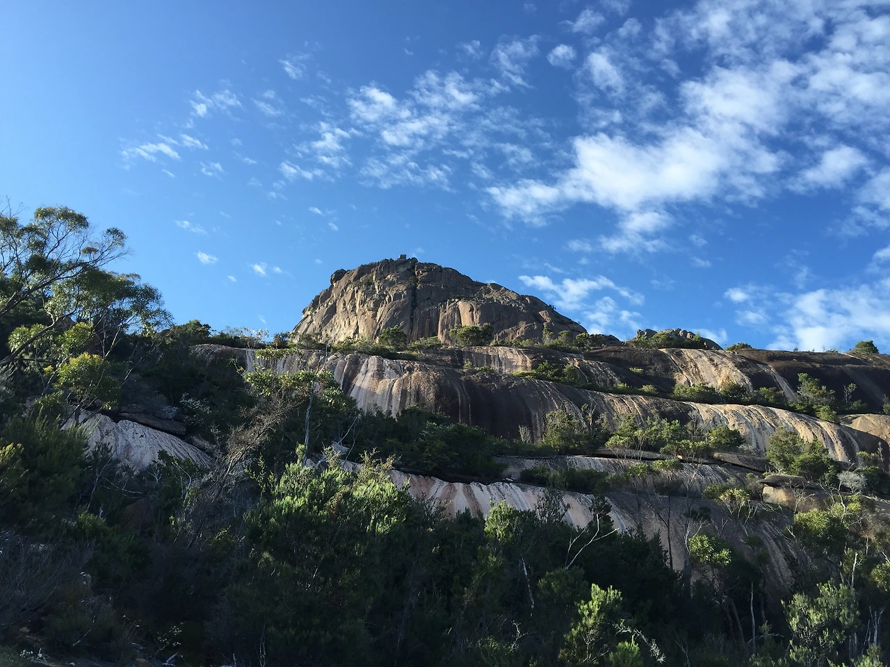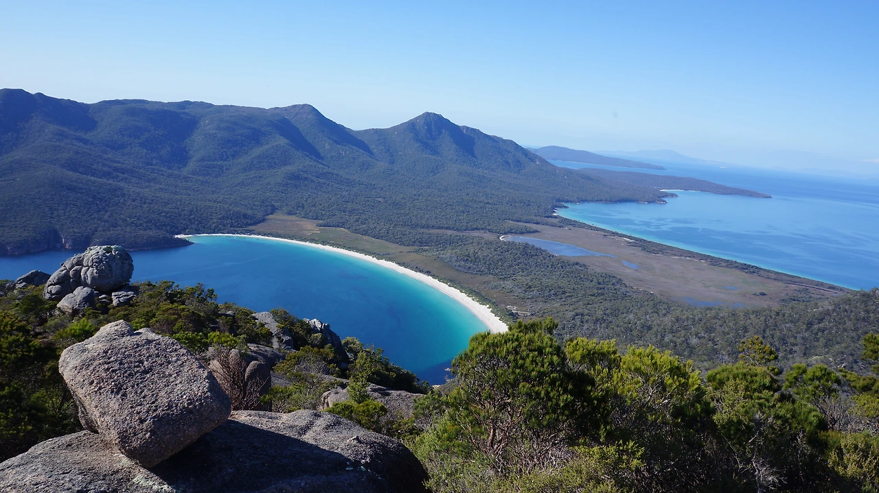 오솔길을 걷는가 싶더니 급경사의 바위길이 이어진다. 오를수록 바다와 산의 경치가 멋지다. 정상에서만 볼 수 있는 숨은 해변, 와인글라스 베이(Wineglass Bay)가 보인다. 세계 10대 해변의 명성을 가진 해변이다. 화강암 산군에 숨은 절경지로 허니문에게도 인기가 많은 곳이다. 와인잔에 담긴 바다에 마음이 취해버렸다.