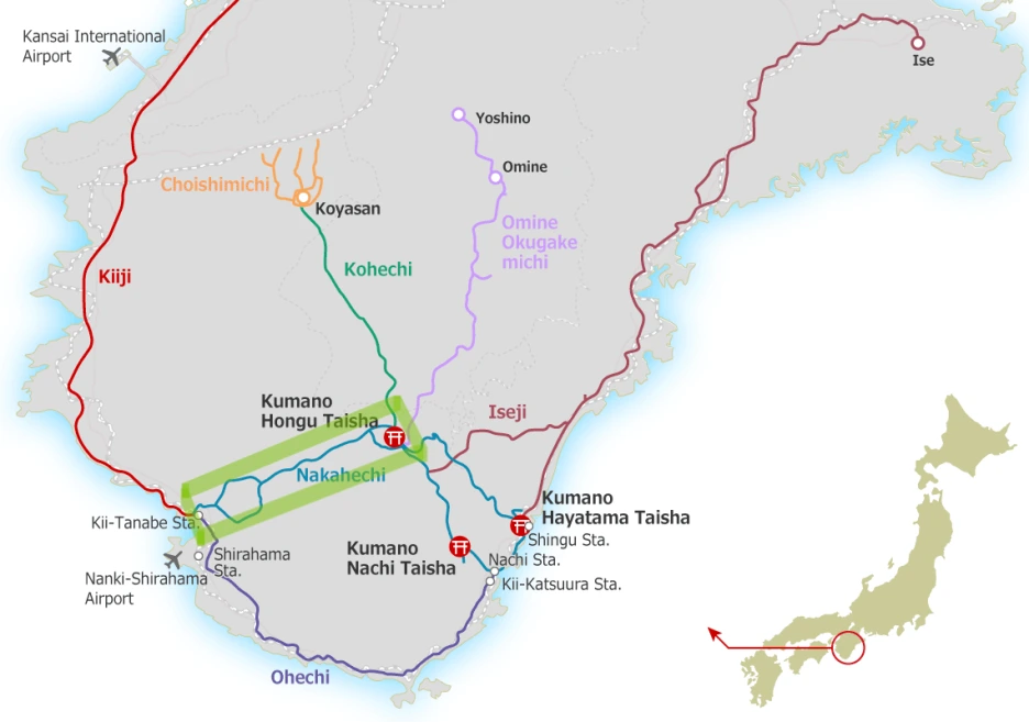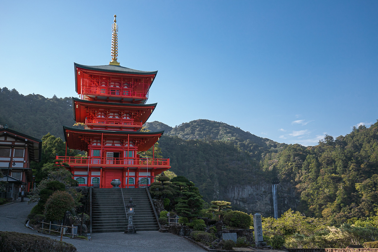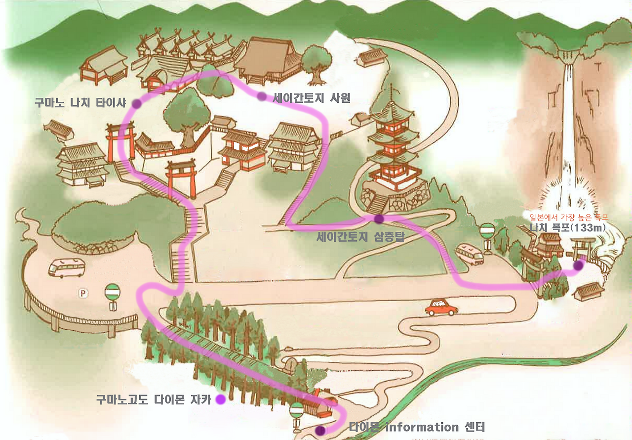 구마노 하야타마 타이샤와 나치 타이샤 순례 구간을 잇는 셔틀 버스가 운행한다. 하야타마 타이샤는 화려한 색채 주황색으로 빛나는 건축물이다. 1000년 된 천연기념물 나기나무에 멈춰 그 기운을 느껴본다. 경내엔 일본의 국보급 보물들이 보관된 신포칸을 둘러볼 수 있다. 나치 타이샤는 일본에서 가장 아름다운 사찰 중 하나인 세이간토지가 있다. 유네스코 세계문화유산으로 지정된 33개 사찰 중 하나이다. 천태종 불교 사원으로 4세기 지어진 유서 깊은 사찰이다. 일본에서 드물게 신사와 불교 사찰이 합쳐진 형태이다. 나치 폭포 앞 웅장한 삼층탑은 상징적인 사진 스팟이다. 133m 낙차. 10m 깊이의 용소를 가진 낙치 폭포와 어우러진다. 나치 원시림의 48개 폭포 중 가장 큰 폭포이다. 순례자들에겐 명상과 수행을 위한 장소였다. 시원한 폭포 물줄기 소리를 느끼며 마음의 정화를 느낀다.
