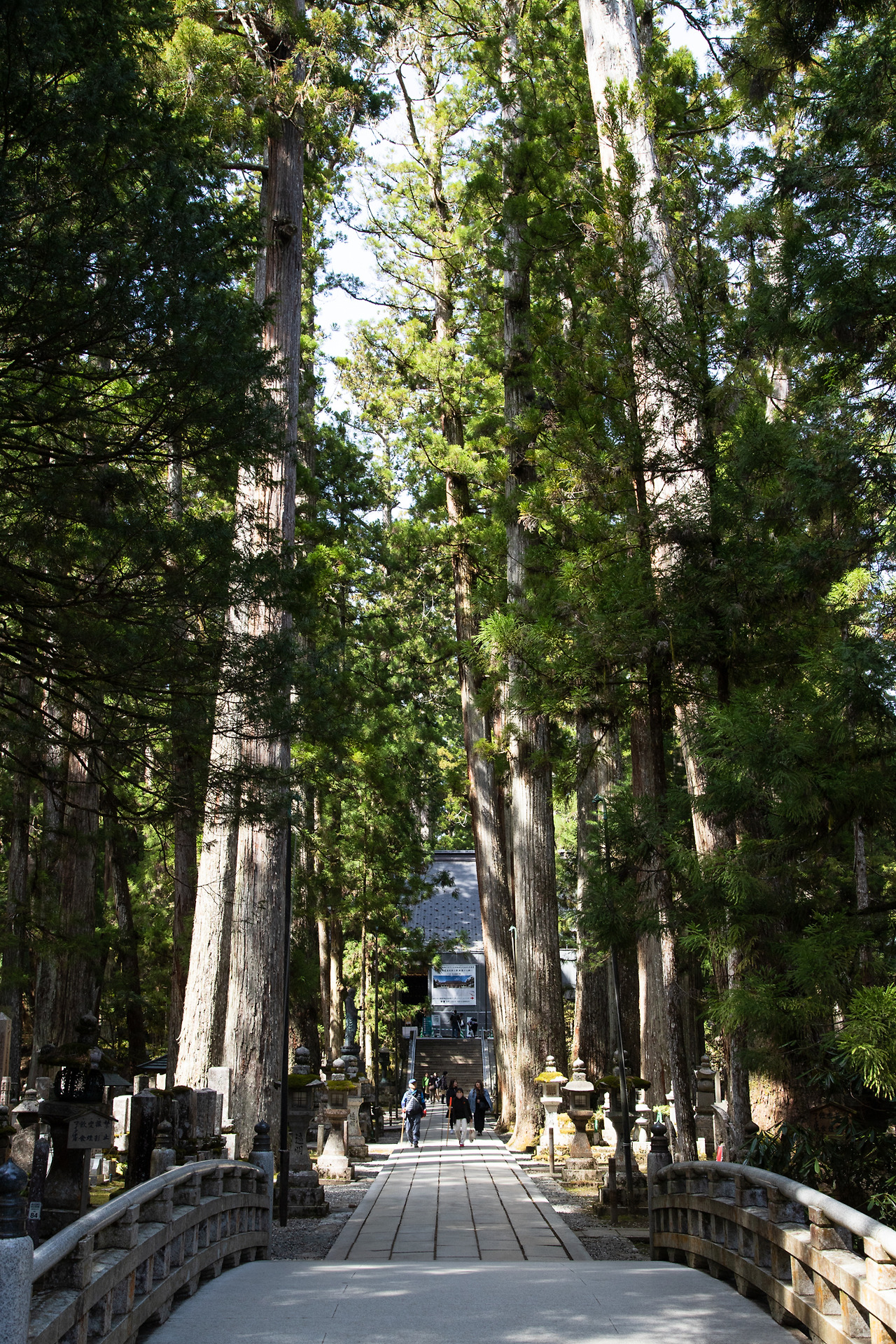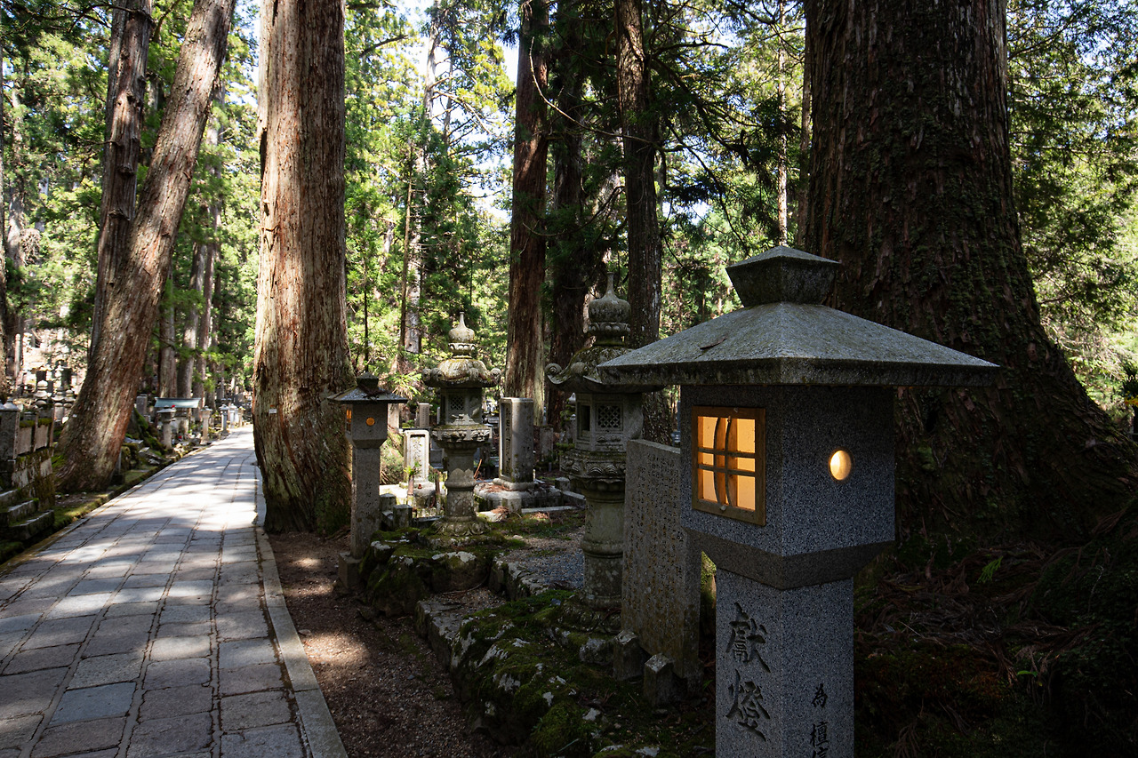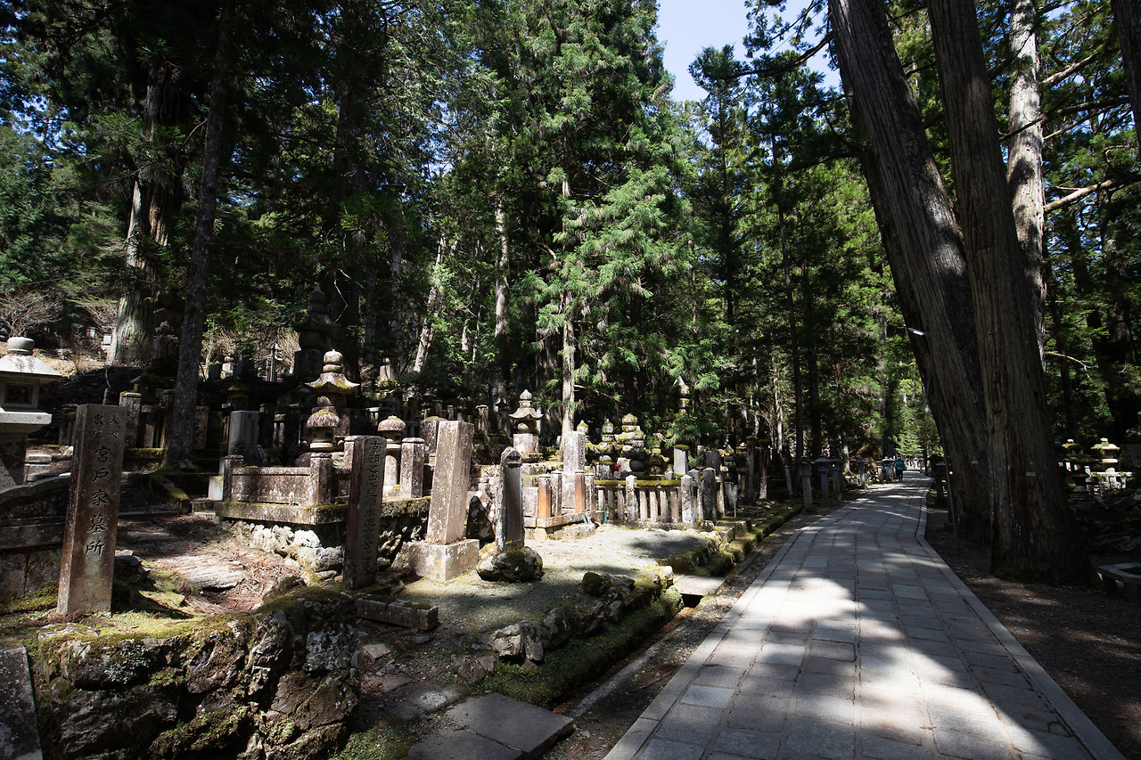 2km 삼나무 숲길을 따라 수많은 역사적 인물들의 묘지, 기념비가 늘어서 있다. 일본인들이 사후 잠들고 싶어 하는 곳이다. 고야산에는 50개 이상의 슈쿠보 (사찰 숙박 시설)가 있어 템플 스테이를 경험할 수 있다. 스님들과 새벽 예불에 참여하거나 사찰 요리(채식) 체험이 가능하다.