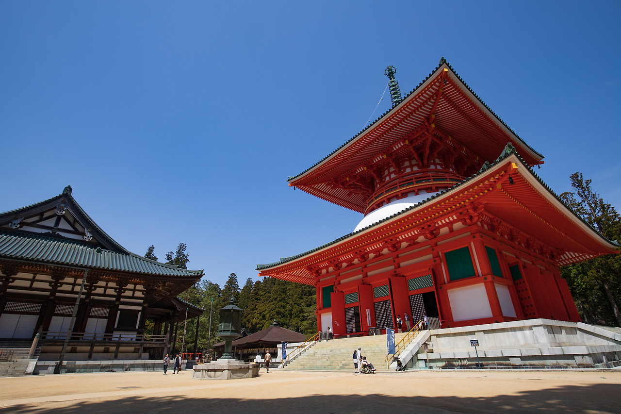 일본에서 가장 존경받는 홍법대사가 창건한 대표적인 성지 순례지이다. 가장 큰 불교 사원 단지 단상가람. 수많은 유명인들의 묘비가 있는 오쿠노인이 있다. 만다라 세계관을 표현한 불당과 탑들로 19개의 건물이 모여있다. 오쿠노인과 더불어 고야산 양대 성지로 꼽힌다. 주홍빛 다보탑은 만다라의 중힘을 나타내는 고야산의 랜드마크이다.