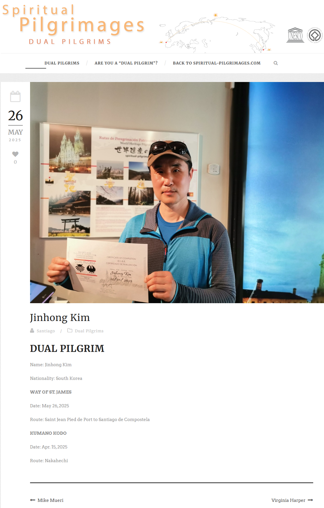 구마노 고도와 산티아고를 모두 걸은 사람은 ‘이중 순례자’가 된다. 완주한 사람들은 축하하고 기념하며 특별한 순레증을 수여받는다.