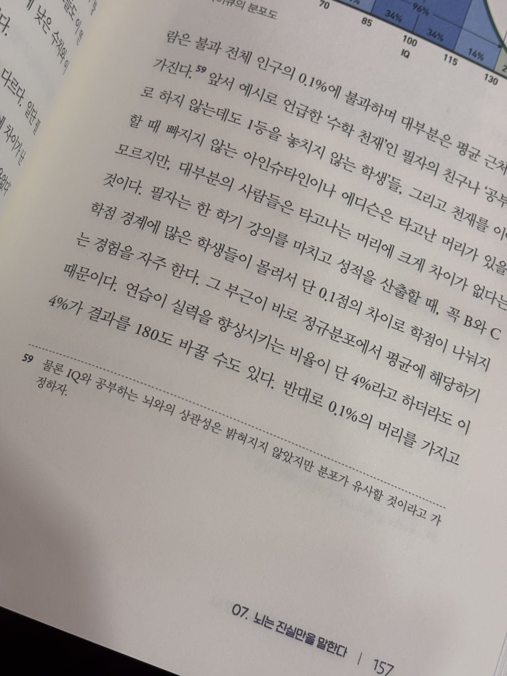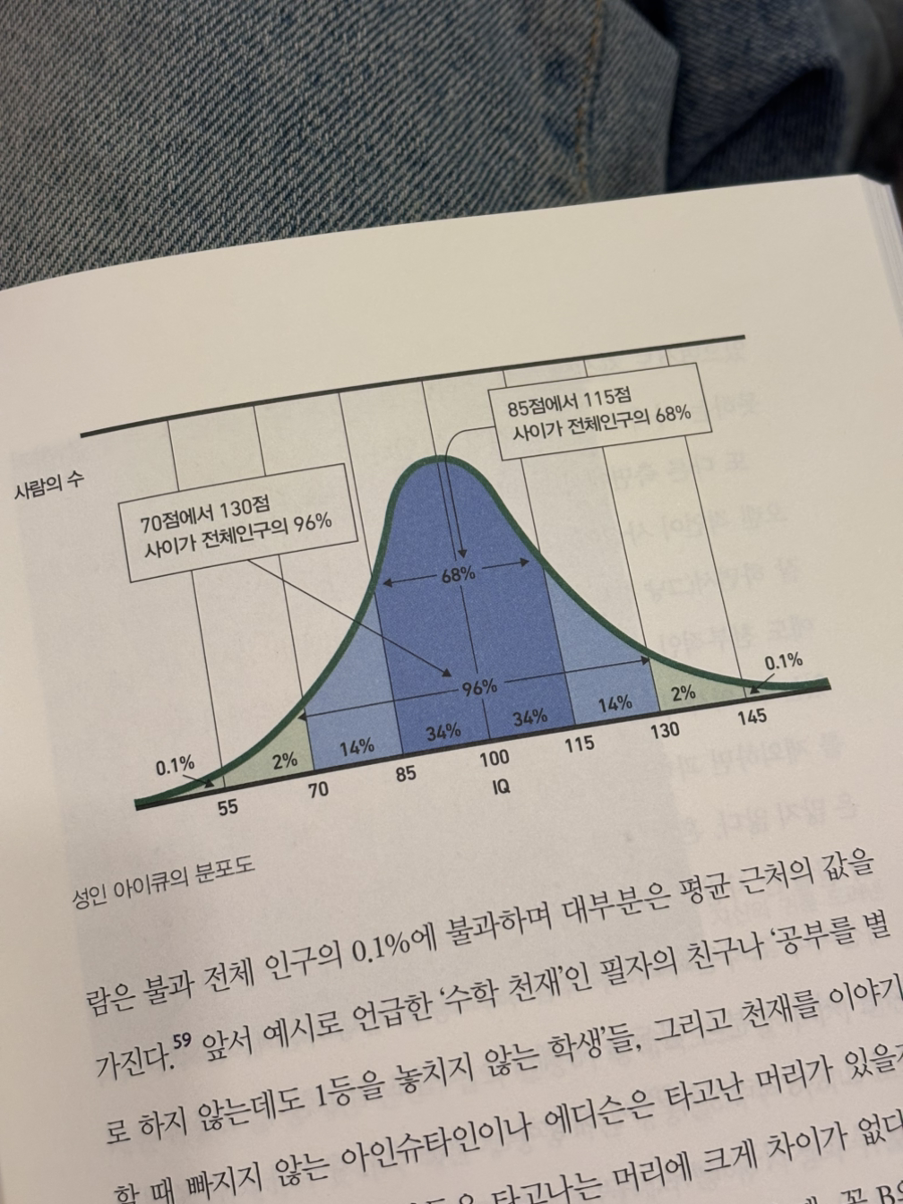 슬프지만 어느 정도 타고난 공부 머리는 존재하고, 공부는 체육 분야에 비해 노력대비 실력 향상률이 드라마틱하진 않다. 그렇지만 희망적인 사실은 우리는 대부분의 정규분포와 평균에 속하는 사람들이고 그 적은 확률이 결과를 뒤집을 수도 있다는 것.