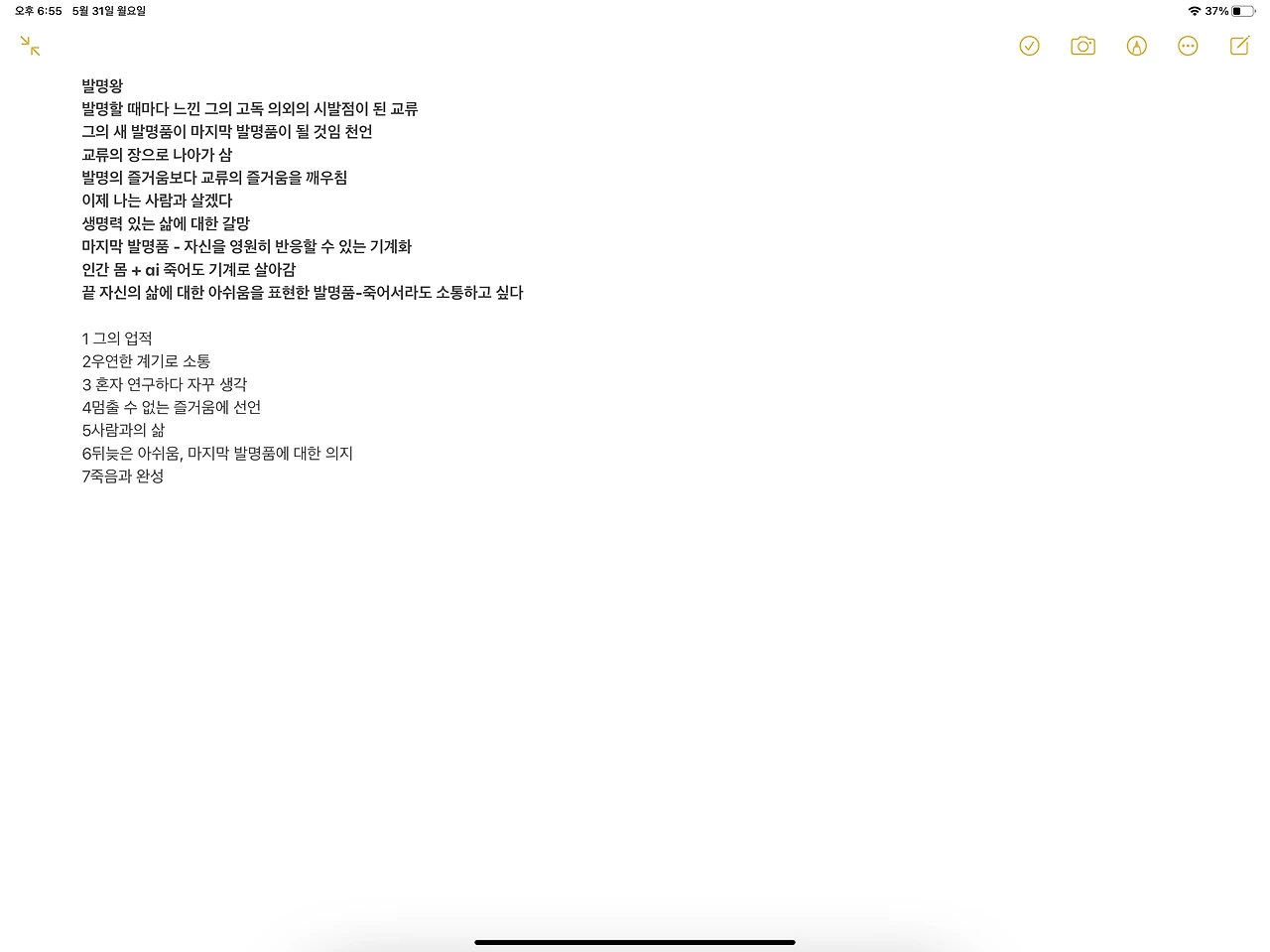 더 이상 그의 삶에 발명이 없다. 그는 이미 대화로 풍족하다. 물고 늘어지는 새로운 호기심을 채우다 보면 발명에 대한 호기심이 자랄 틈이 없다. 그래도 괜찮다. 발명왕은 사람들이 붙인 타이틀이고 그는 지금까지 호기심을 좇아 그의 삶을 살았을 뿐이다. 그는 예나 지금이나 자신의 삶 살기 바쁘다.
