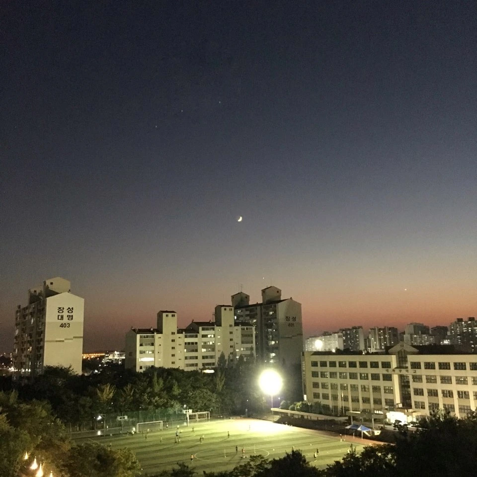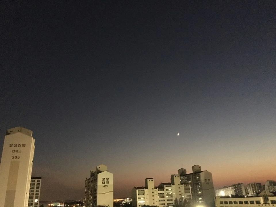 동생이 손가락을 쭉 뻗으며 가리킨 곳은 하늘. 그냥 하늘도 아닌, 파스텔톤 물감을 풀어놓은 듯한 바탕에 있어 더 돋보이는 손톱 달이 아주 가깝게 밤하늘 위에 날카롭게 걸려있었다. 너무 선명하고 근사해서 이게 진짜 인가 싶어 눈을 비비고 다시 보았다.