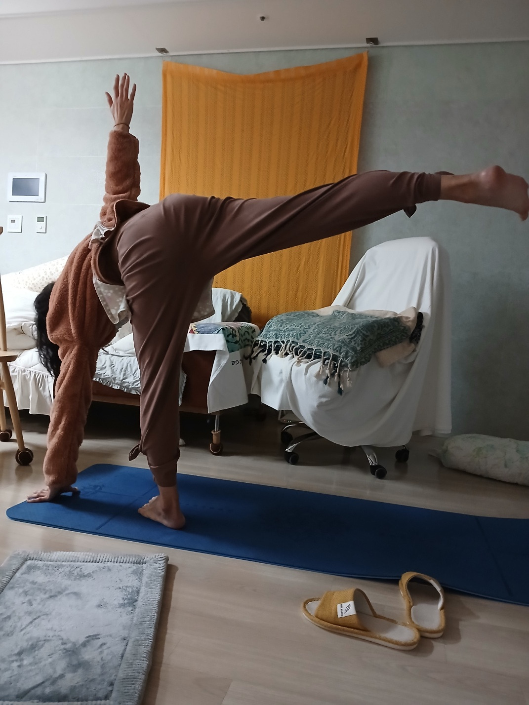 요가 프로필 사진을 찍는다면 취하고 싶은 포즈가 <아르다 찬드라> 데 수업 시간에 두 분의 선생님이 내 옆에서 잡아주고, 블락도 대주며 “괜찮다, 괜찮다.” 위로와 응원, 급기야는 내가 들고 있는 한쪽 다리를 부축까지 해주었지만 끝내는 맘에 드는 동작을 완성하지 못했다.