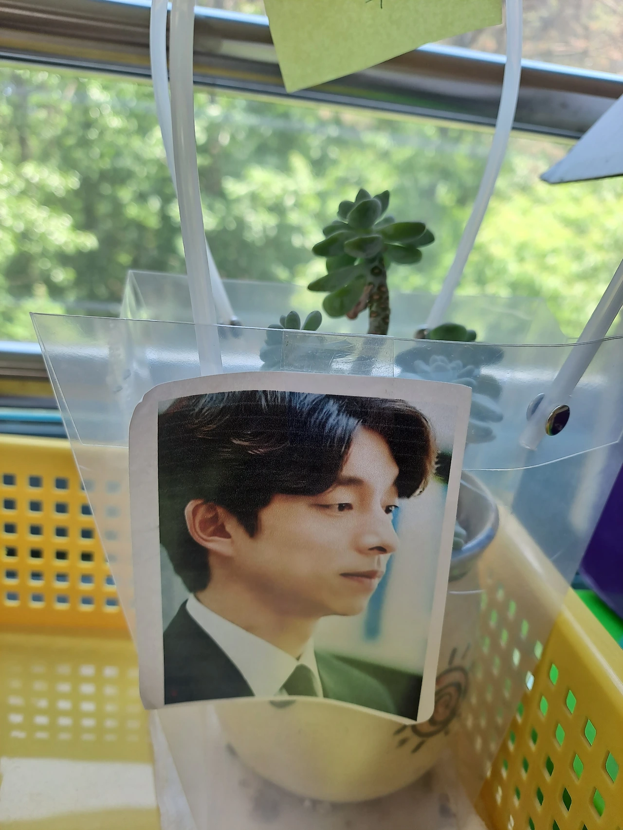 처음에는 화분에 공유 얼굴이 떡하니 붙어있으니 둘이 내외하고 낯설어 어색했지만 매일 보니 점점 친해졌고 공유와 내가 공유하고 있는 화분을 잘 돌보려고 노력했습니다. 저는 잎에 붙어있는 먼지를 닦아주고 공유님은 다육이를 데려가려는 저승사자를 무찌릅니다.