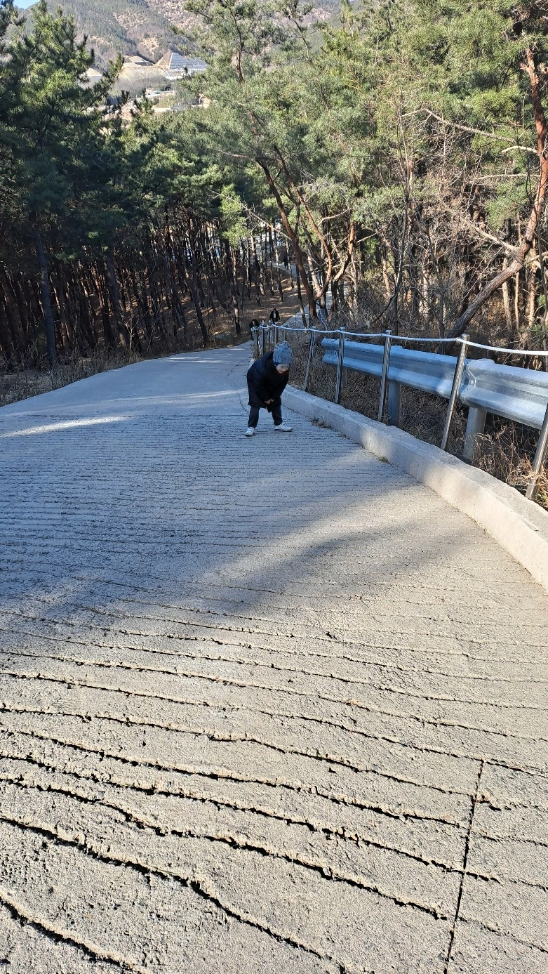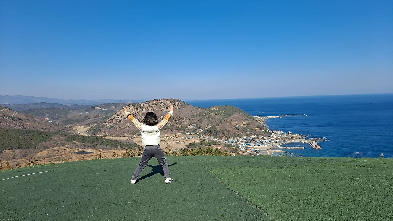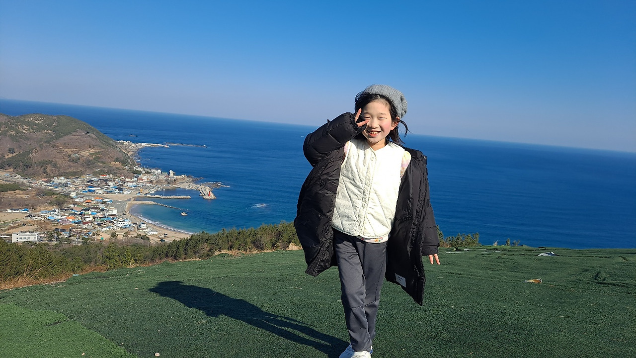곤륜산 정상의 넓은 평지에 인조잔디가 깔려 있고 패러글라이딩을 타기도 하는 곳이었다. 걸어서 정상까지는 약 20분 정도 소요가 된다. 곤륜산은 포항의 핫플레이스로 정상에서 보이는 탁 트인 경치를 배경으로 인생 샷을 남기기 위해 많은 관광객이 찾고 있는 곳이다. 올라가는 진입로는 경사가 급하고 길은 상당히 가팔랐다. 앞에 가는 커플은 서로의 사진을 찍어주며 밀어주고 당겨주고 알콩달콩 가고 있었는데 딸과 나는 그때 티격태격한 상태여서 말없이 묵묵히 올라만 갔다.