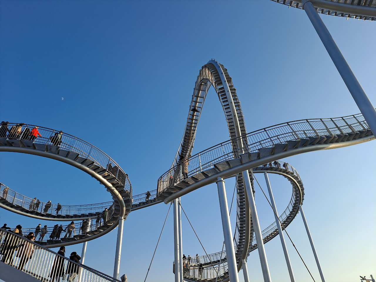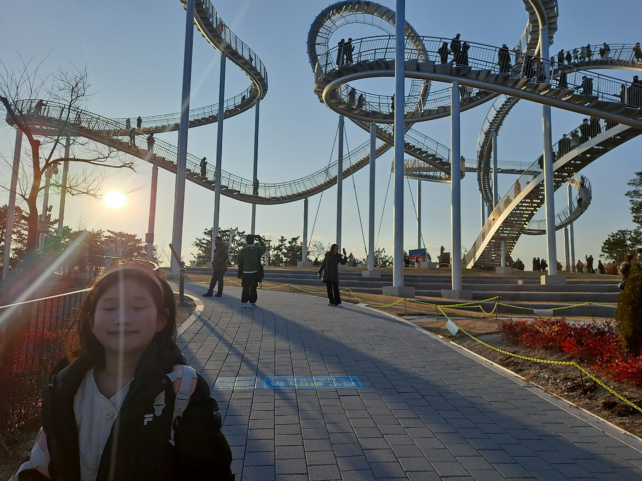 이렇게 우리는 세탁기를 잠시 까맣게 잊고 팔짱을 끼고 룰루랄라 다른 포항의 하늘로 날아갔다. 바로 스카이워크. 포항의 최첨단 하늘을 볼 수 있는 곳. 지점토로 만들어도 이렇게는 못 만들겠다. 구룡포의 10마리 용중 하늘로 못 올라간 용이 여기서 똬리를 틀었는지 정말 대단하다. 그리고 여기를 올라가는 사람들은 더 대단했다. 우리도 질 수 없었다. 후들거리는 다리에 힘을 빡 주고 한 걸음씩 올라갔다. 옆에 손잡이도 있고 뒤에 사람들도 많아서 굴러 떨어질 염려는 없을 것 같았는데 바람에 조금씩은 흔들리는 느낌에 없던 고소공포증도 생길 거 같아 포기하고 다시 살금살금 내려왔다. 연우가 내려오면서 한 말이