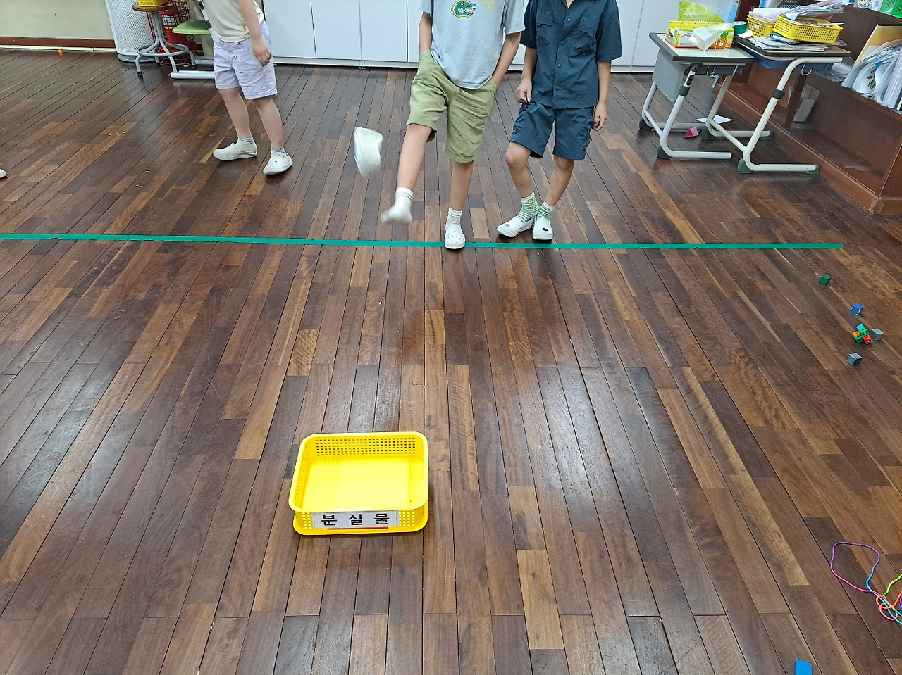 좁은 교실에서 하는 올림픽이라 공을 사용하기도 위험하고 부상자가 속출할까 봐 못 한다. 농구는 바구니를 적당한 위치에 놓고 실내화를 반쯤 발에 걸친 뒤 골인시키기로 변형했다. 나부터 시범을 보였지만 될 리 만무하다. 누구도 골을 못 넣은 채 창던지기로 넘어갔다.