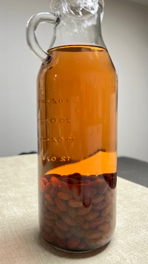 냉동실에 보관해 두었던 건구기자 열매에 25도 담금주를 부어 약술을 담갔다.