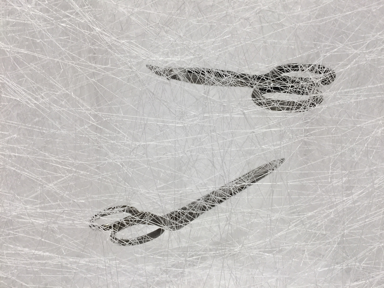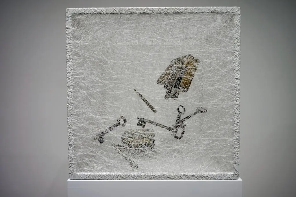 전시장 2층에 올라가 보니, 이러한 오브제들을 투명한 철제 틀 가운데 배치해, 그 주위를 실로 감싼 작품들도 전시 중이었습니다. 열쇠, 탯줄 자르는 가위 등 생명에 관해서 고민하던 그녀에 삶과 연관된 오브제들을 배치해둔 모습에 역시 끊임없이 인간의 존재에 대해 탐구하는 작가의 철학이 느껴지네요.