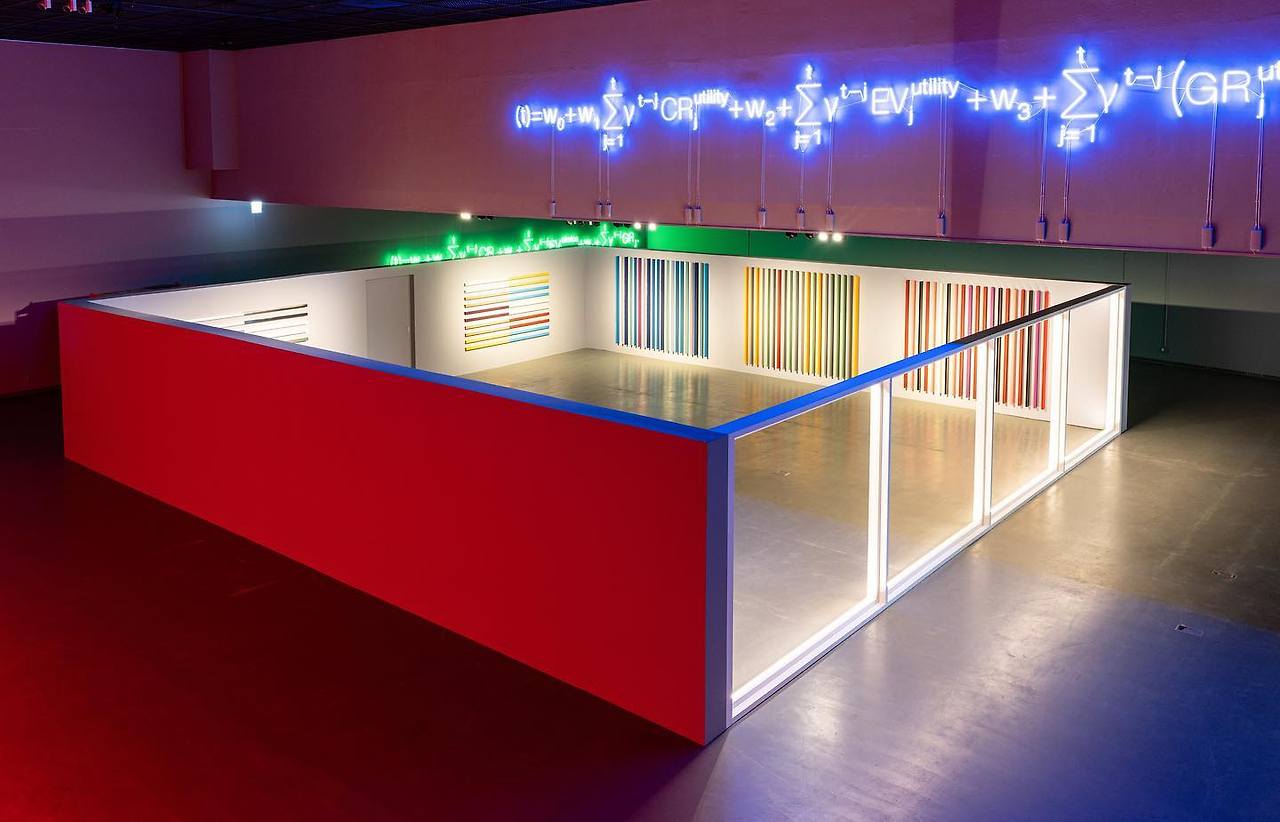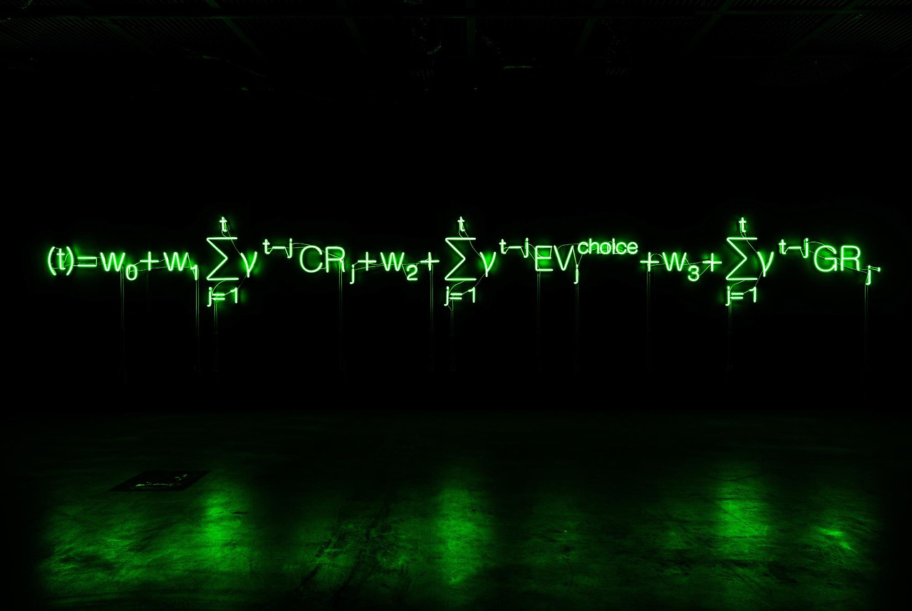 하지만 그는 일련의 과정을 직접 묘사한다기보다는, 익숙한 존재들과 새로운 모습으로 마주할 때 우리의 인식과 경험의 감정적이고 형식적인 측면이 어떻게 변화되는지에 대해 황혼의 빛과 형태를 불러일으킵니다. 하이라이트 작품과 함께 살펴보자면, 전시장 벽면을 둘러싸고 있는 네온사인 작업 Animated lamps는 사람들을 일과 삶이 합쳐진 막연한 공간으로 들여오고 있는데요. 인간의 행복을 계산하는 공식을 포함해, 삶에 적용해볼 수 있는 다양한 공식을 제시하며 전시장 안에서 형형색색의 빛으로 관객을 맞이하고 있죠.