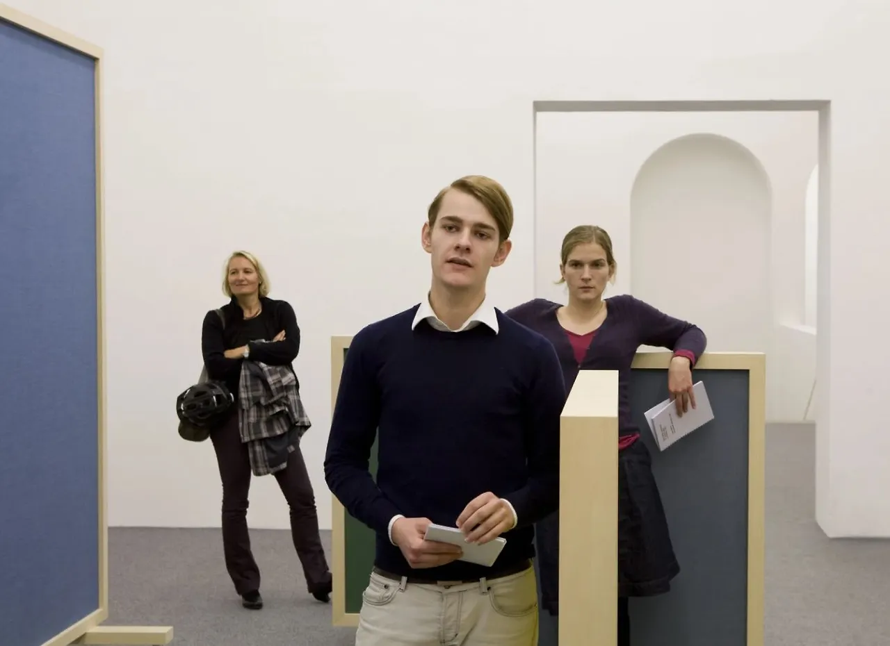 이러한 맥락의 대표적인 예로는 “Mirrored Image: A Volvo Bar”가 있습니다. 2008년 뮌헨 쿤스트베레에서 8막의 퍼포먼스로 선보인 해당 설치 작품은 25개의 싱글 파티션과 월 텍스트(타이포그래피), 그리고 극본으로 구성되어 있는데요. 작가가 디자인한 구조물 안에서 젊은 배우들과 협업하며 시대를 반영하는 텍스트를 발췌하고, 이는 전시 기간 동안 현장에서 펼쳐질 일련의 퍼포먼스로 재구성됩니다. 또한 지난 20년 간 리암 길릭의 작품에서 등장했던 다양한 캐릭터들을 재소환하며 새로운 관계로 드러나길 시도하고 있지요. 연극이 진행되는 동안, 배우들은 각각의 색상과 크기로 구성된 칸막이 스테이지를 이동하며 퍼포먼스를 진행합니다.이를 통해 그의 작업에서 배우를 포함한 관람객 역시 전시의 일부로 들여오며, 작품과 전시에 대한 다양한 생각과 이야기들을 만들어가는 존재임을 일깨우고 있죠..