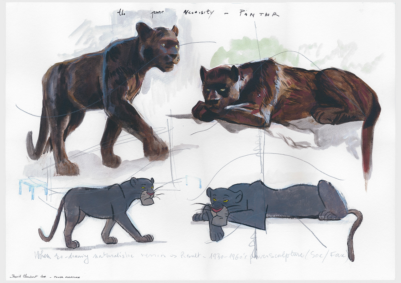 작품은 영화 속 메인 캐릭터로 등장하는 바기라(Bagheera, 팬서), 발루(Baloo, 곰), 카(Kaa, 뱀) 등의 동물에 초점을 두고 있는데, 1967년의 정글북에서는 이들이 재치 있는 대화나 춤, 농담을 나누는 동물로 묘사되었지만, 해당 작품에서는 의인화 없이 '현실적' 동물로 여겨지는 점 또한 흥미롭다. 작가는 그들을 대신해 정글에서 방황하고, 샘에서 물을 마시며, 나뭇가지에서 낮잠을 자며 서로를 관찰한다. 각각의 움직임은 정밀하게 지속되며, 관객들은 드로잉을 통해 모든 디테일을 관찰하게 된다. 약 3년이라는 기간에 걸쳐, 원작의 프레임에서 다시 정교한 수작업으로 완성된 클레르부의 신작에는, 기존의 리드미컬한 원작과 완전한 대조를 이루며, 서사성이 제거된 동물들은 정글을 배회하는 동시에 스스로의 이야기를 재구성한다.