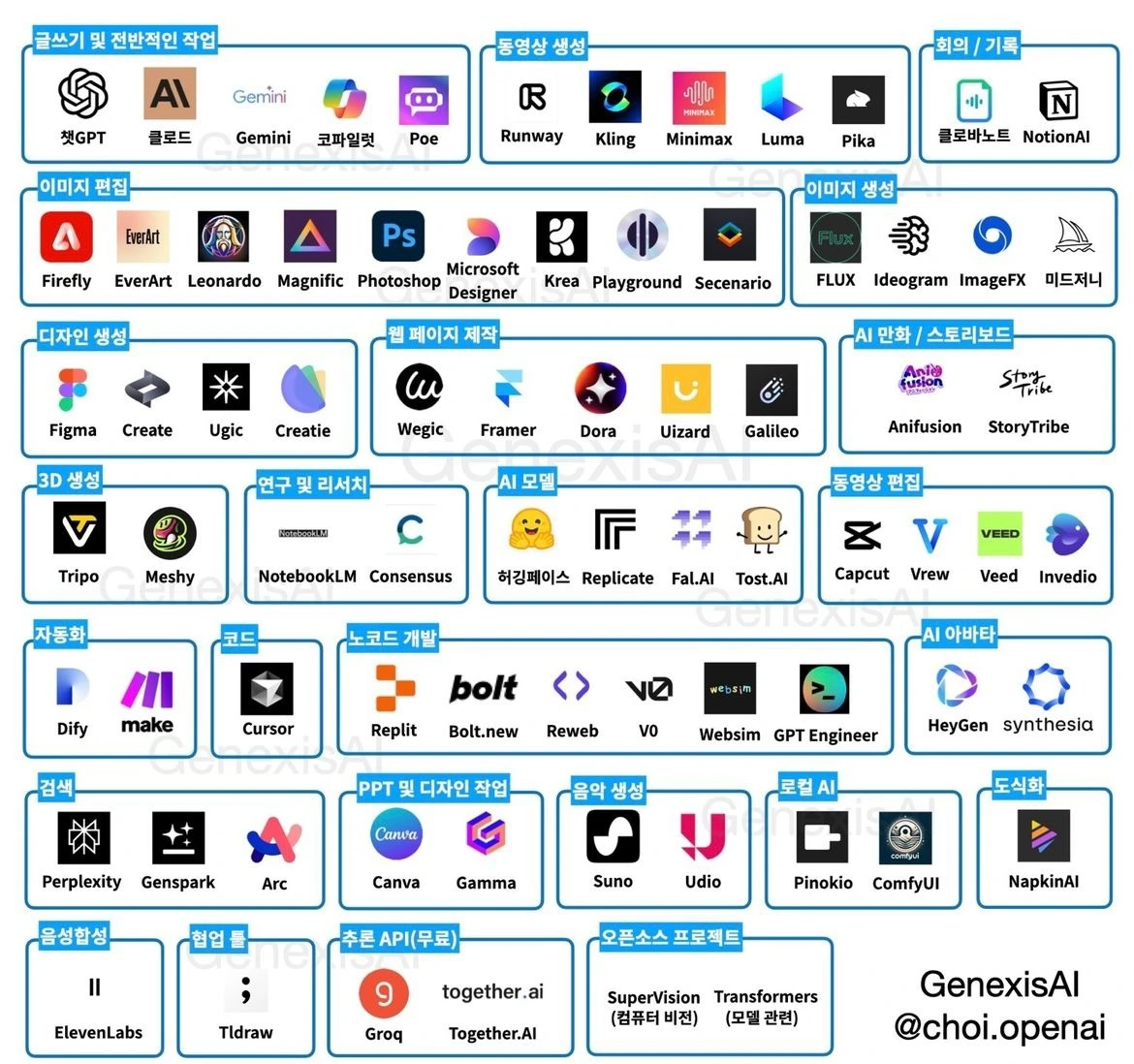 https://lnkd.in/gqVQqQQq 님이 만드신 AI 도구들의 최신 현황표입니다. 각 카테고리별로 보기 쉽게 정리된 자료라 공유드립니다.