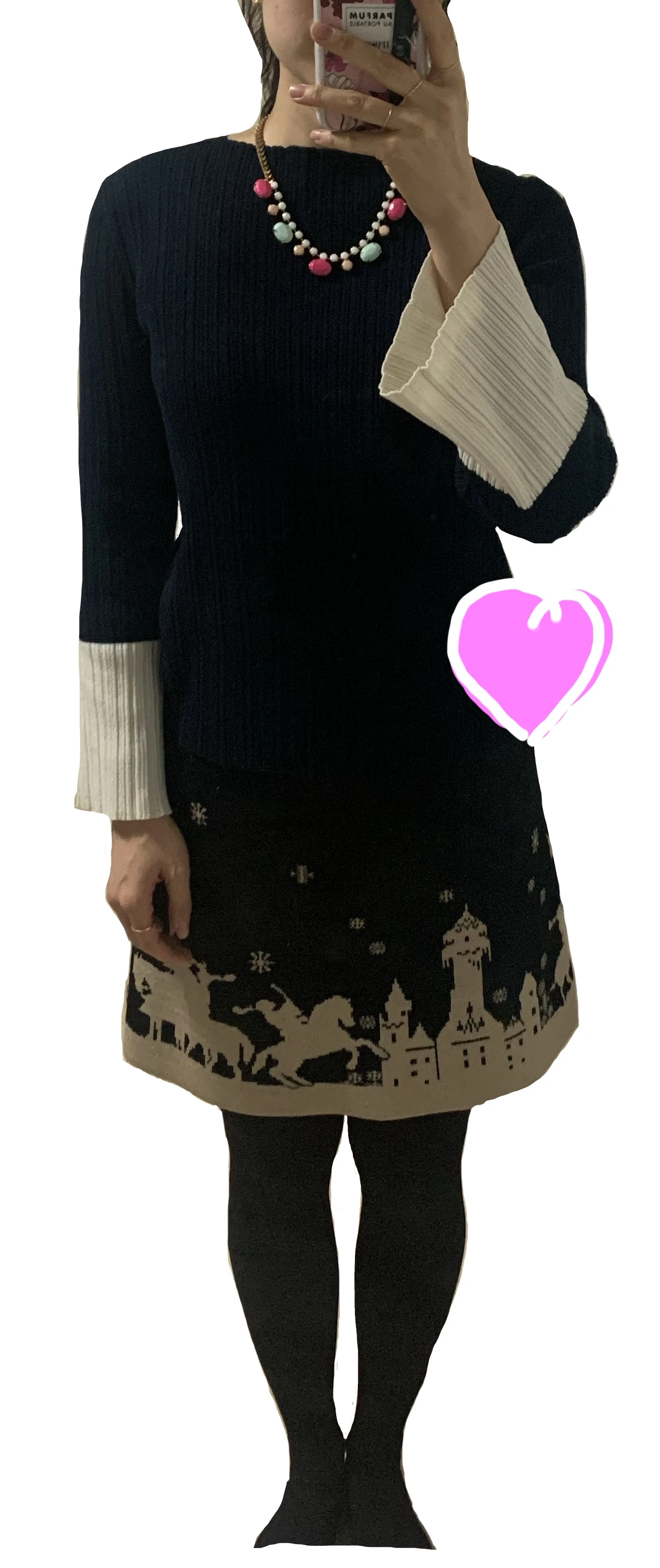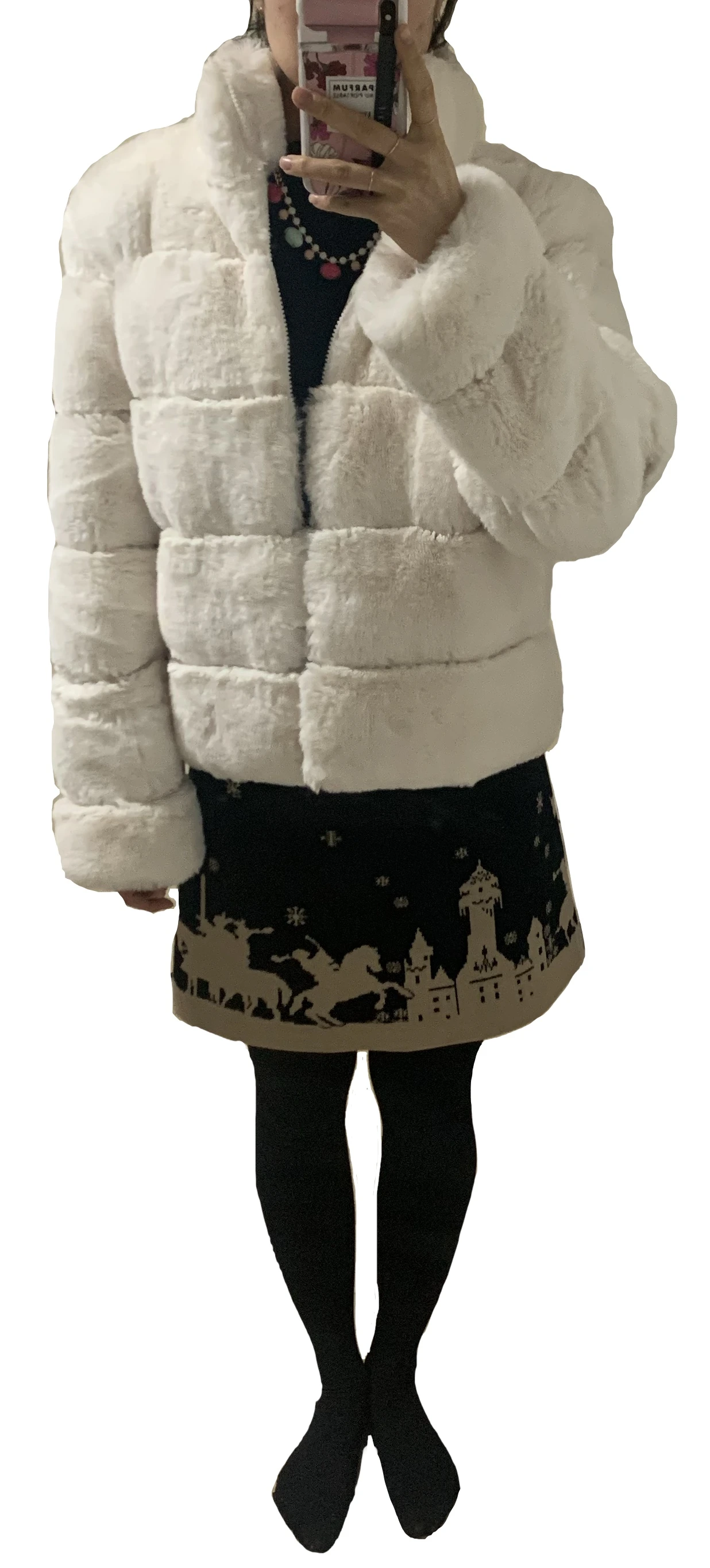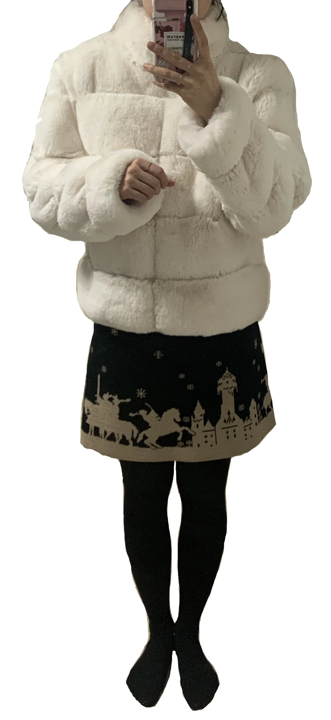 상의 니트: 2017. 니트 스커트: 2006. 퍼 자켓: 2021. 목걸이: 2013.