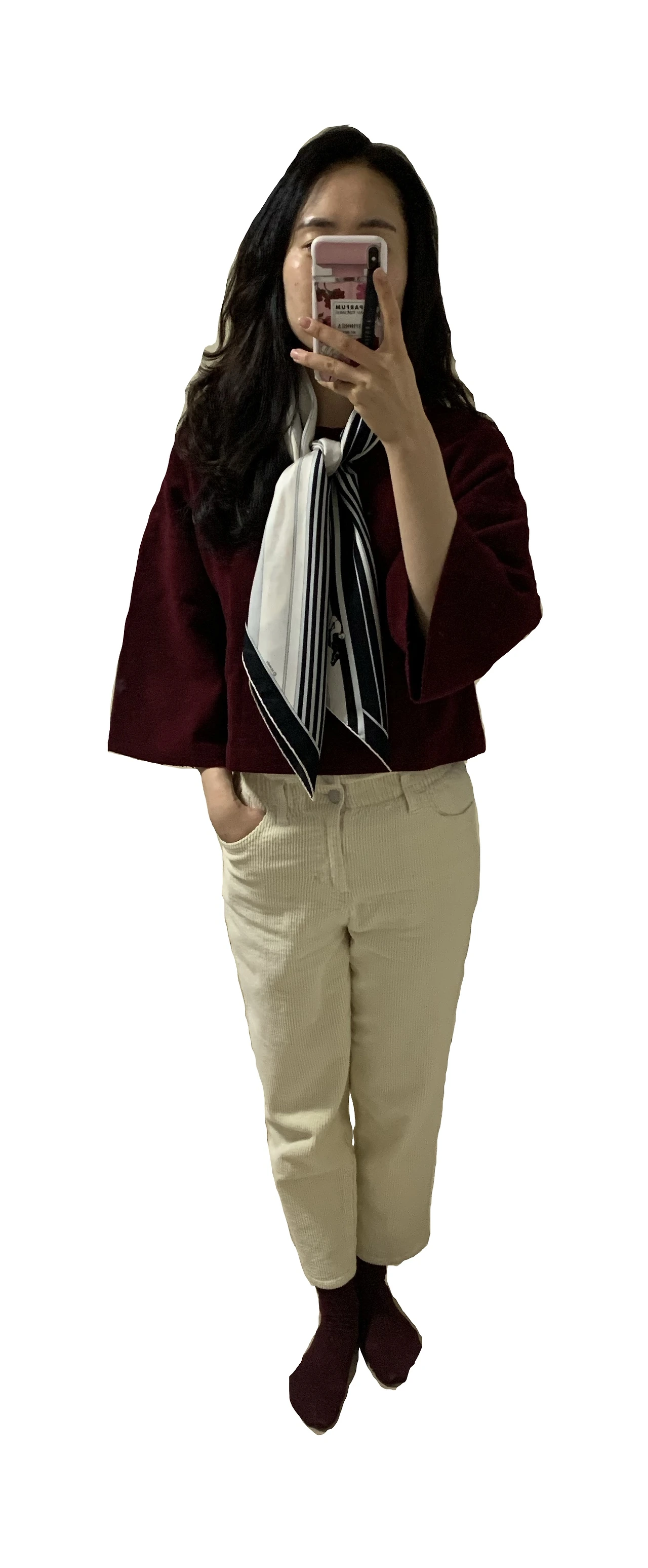 버건디 상의: Paul&Joe. 2014. 코듀로이 진: Guess. 2021. 스카프: Hermes. 2014.