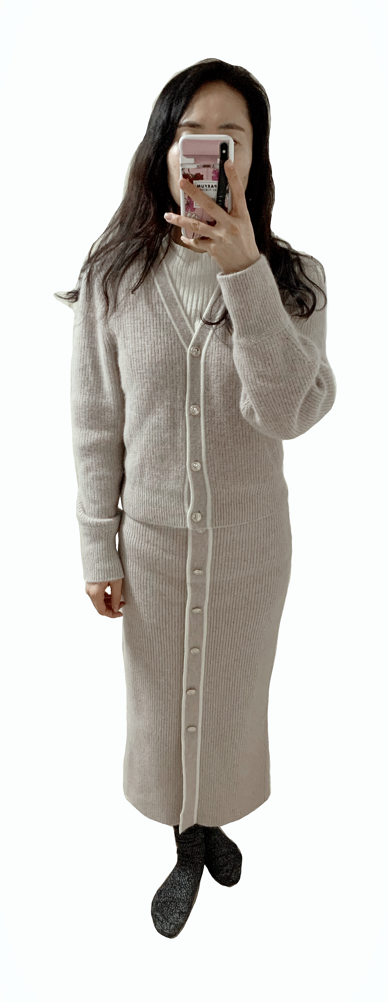 흰색 니트: TIME. 2017. 니트 상하의: MAJE. 2021.