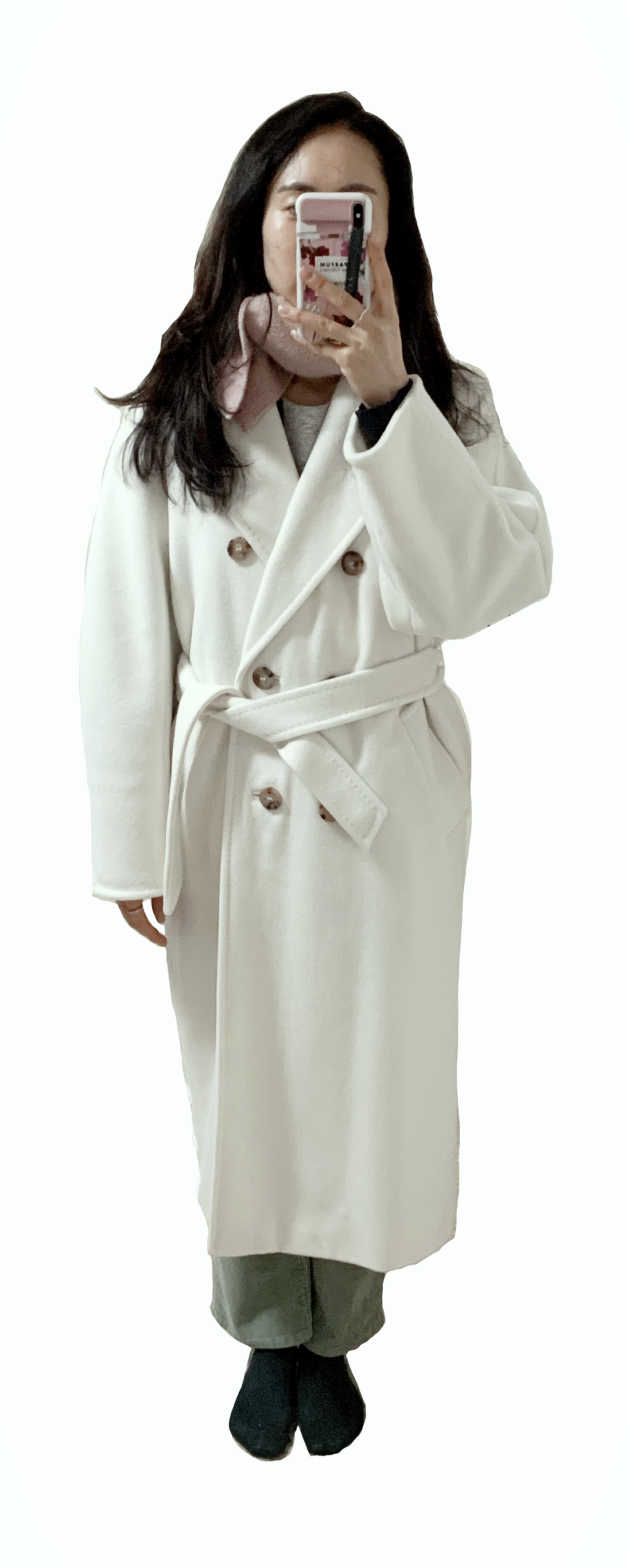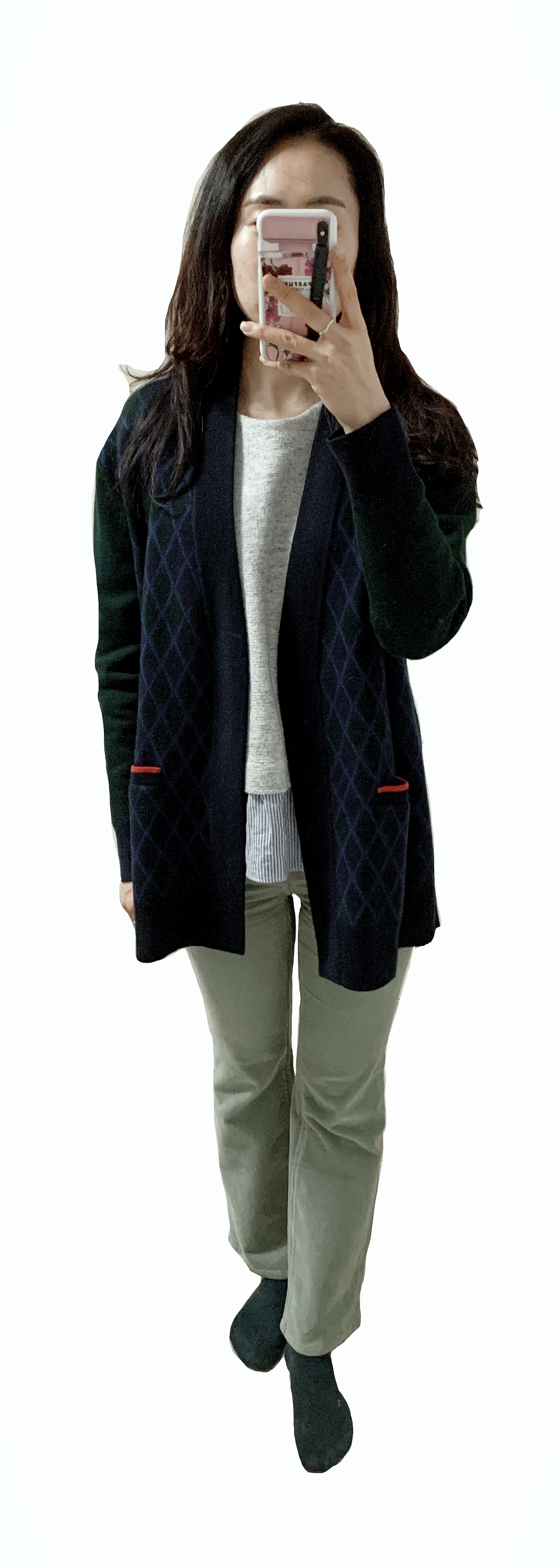 상의 블라우스: JINI. ? 카디건: Sandro. 2017. 코듀로이 진: Guess. 2021.