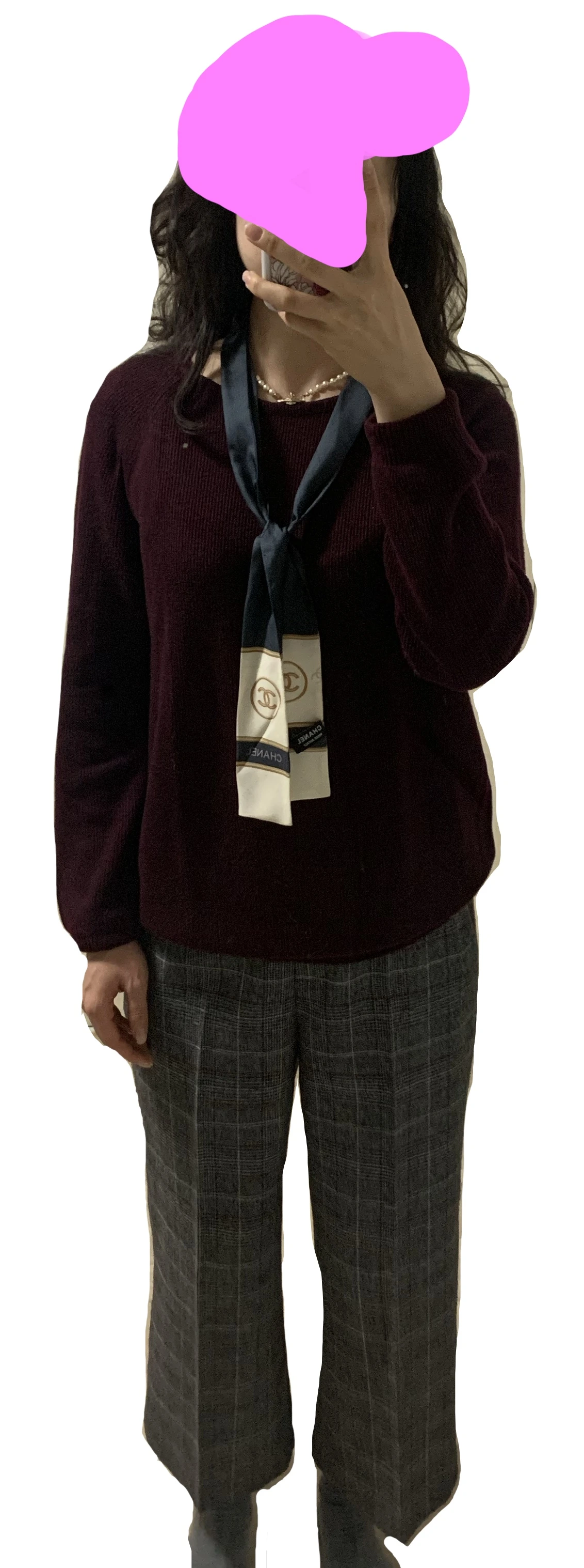 버건디 니트: 2017. 체크바지: 2017. 플리츠: 2021. 목걸이: 2019