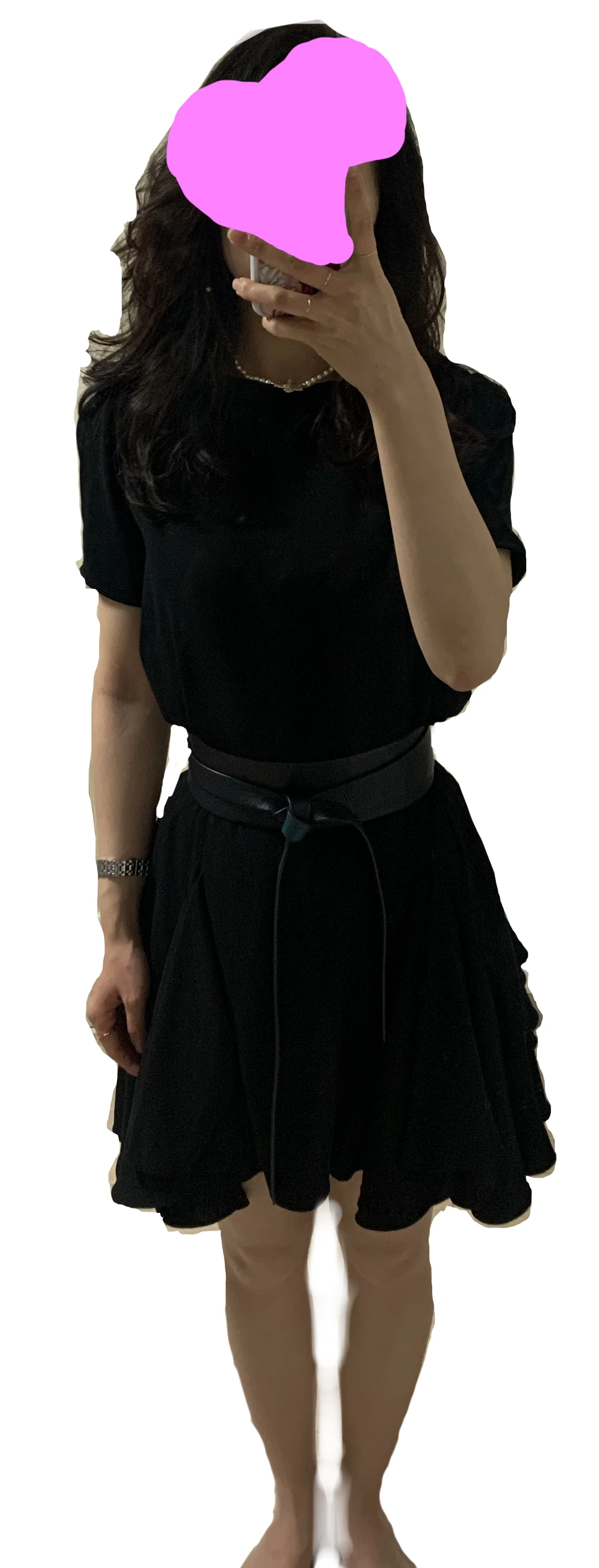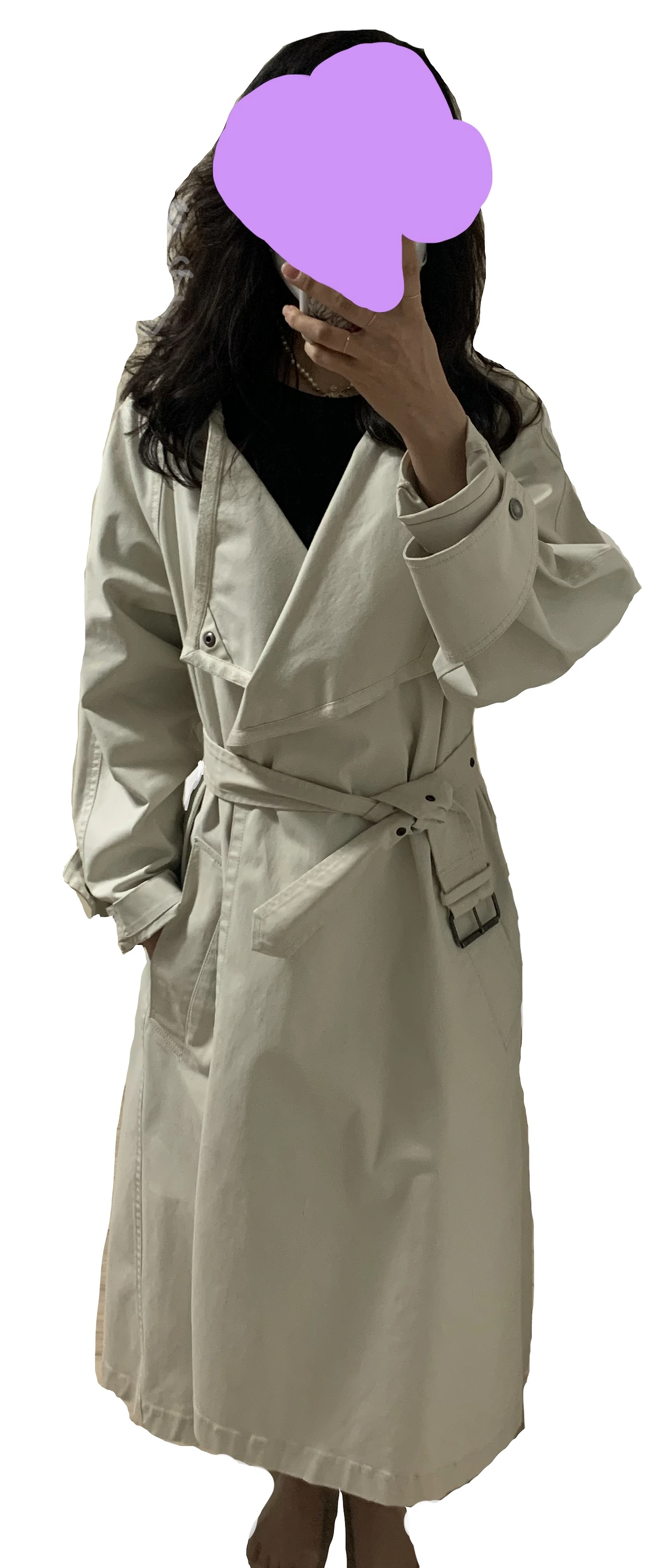Cocktail dress: 2013 Paris. Leather belt: 2013 Paris. Trench coat: 2019 Korea.