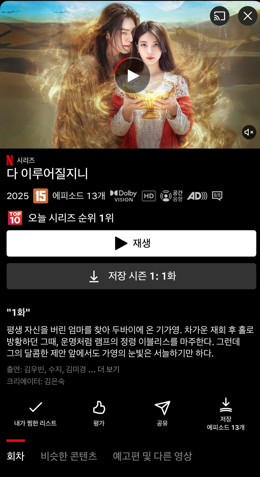 드라마 내용은 그렇게 참신하지 않았다. 마이 데몬인지 도깨비인지. 여주는 마이데몬 주인공을 가져온 듯도 하고 사이코지만 괜찮아 캐릭터를 가져온 것 같기도 하고. 시 읽는 건 도깨비에서 했기 때문에 더 이상의 몰입을 가져오지는 못했다. 내가 연속 정주행을 하는 탓에 집중도가 떨어졌을 수도 있고. 초반 몇 화는 좀 지루하기도 해서 참고 보긴 해야 했다. 다른 리뷰어의 말들이 공감이 되는 시간들이었다. 또 스크립트가 그렇게 쫀쫀하게 탄탄하게 엮여있지도 않는 것 같았다. 글쎄. 13 화면 적당한 시간일 텐데 앞부분은 좀 끄는 경향이 있고. 회상하는 장면에서 지니가 “고려로 함께 못 갈 것 같아.”라고 했는데 뒷부분 기억에서는 그렇게 말할 시간이 전혀 없고. 이거 뭐지. CG도 굉장히 많이 쓰고. CG를 쓰는 거라면 최근에 영화 “전지적 독자 시점” 그런 느낌이 더 나았는데. 물론 CG를 잘 하긴 했지만 그렇게 자연스럽게 묻어나서 깔끔하진 않았달까. 김우빈이 좀 아까운 드라마였달까.