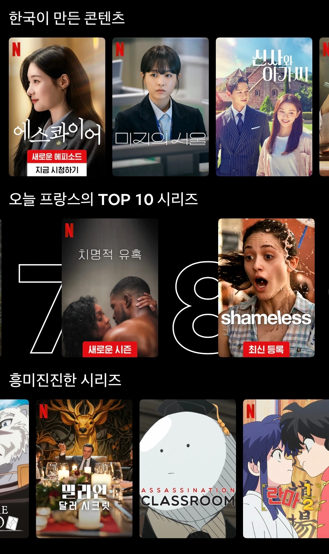 프랑스에 갔을 때 넷플릭스 콘텐츠는 우리나라에서 봤던 콘텐츠와 매우 달랐다. 물론 탑 10에 있는 드라마나 영화도 달랐다. 우리나라와 겹치는 건 <웬즈데이> 정도였다.