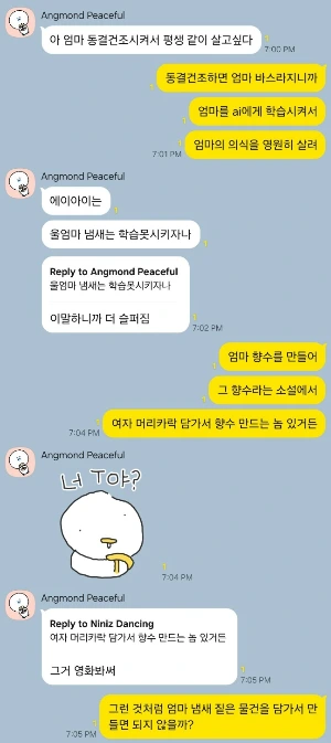 엄마를 동결건조하거나 ai만드기 둘 다 하고 싶지 않지만 정 선택하자면 나는 ai를 만드는 것이 나아보인다. 그냥 보내드리는 것이 엄마에 대한 예의같다. 내 가상의 딸이 나를 동결건조하거나 ai로 만들면 싫을 것이다. 죽었으면 보내야지 계속 붙잡고 있어서 당황스러울 거 같다.