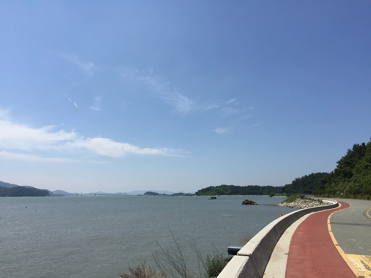 다산초당에서 '가우도'로 가는 '망호출렁다리'까지는 걸어서 약 3시간 정도가 걸렸다. 시골의 한적한 분위기와 구강포 너머로 펼쳐지는 첩첩의 산들이 탄성을 자아내기 충분하기에 수북한 발걸음이 하나도 아깝지 않았다. 남쪽 끝자락이라 높은 산은 없지만 낮은 수많은 산봉우리들이 도토리 키재기 하듯 부대껴있는 모습도 귀엽기만 하다. 게다가 해안도로는 자전거 도로와 함께 깨끗하게 잘 닦여 있어서 자전거 타고 싶은 충동을 마구 일으킵니다. 운치있게 멋진 풍경 속을 하염없이 걷다보니 어느새 저 멀리 가우도와 망호출렁다리가 그 모습을 드러낸다.