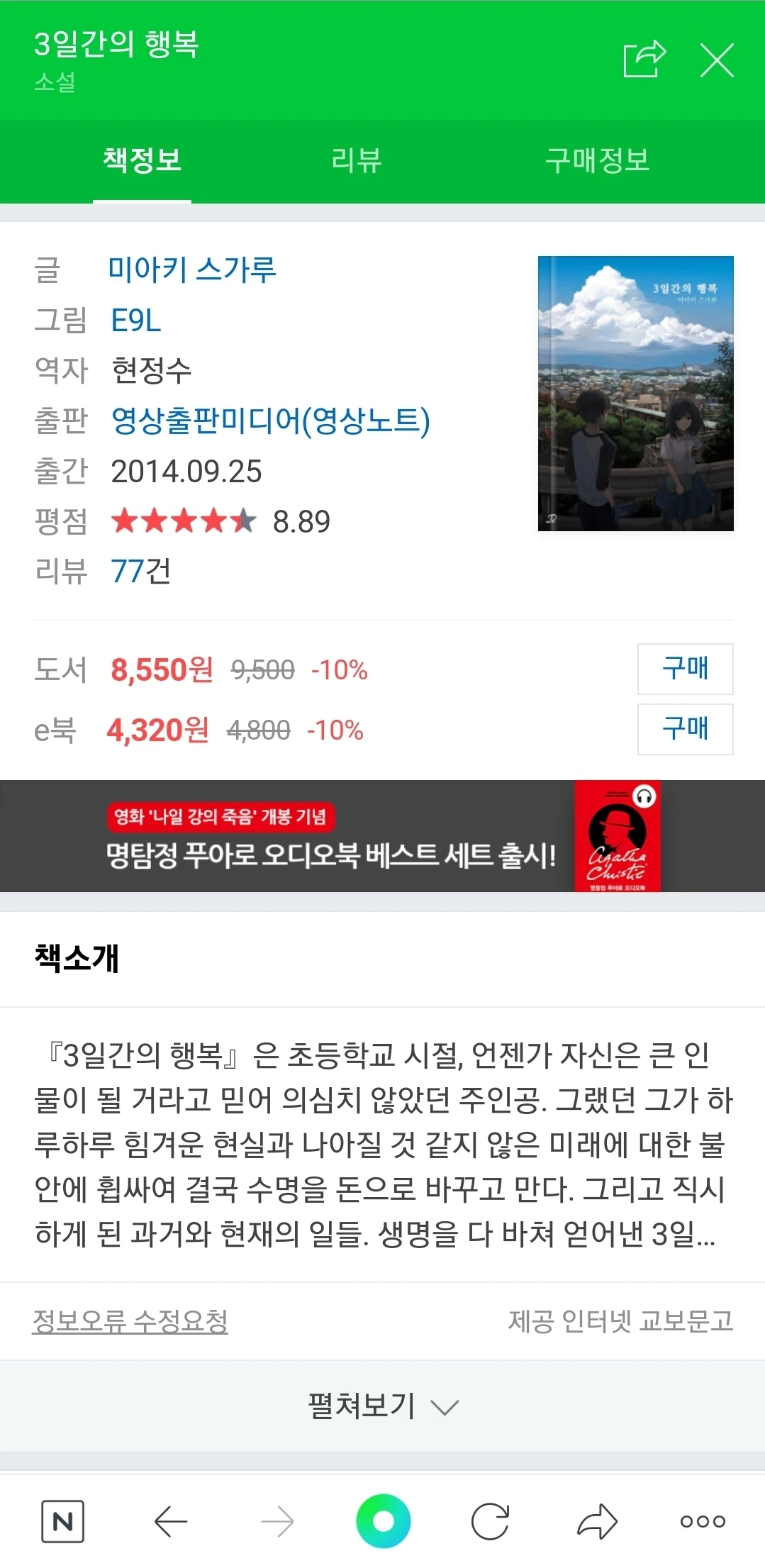 이번 책 또한 지인의 추천을 받았는데, 일본 소설은 등장인물 이름을 외우기 어려워서 선호하지 않는 편이라 선뜻 손이 가진 않았습니다. 하지만 글의 소재와 시놉시스가 흥미로워서 읽게 되었습니다. 이 책의 원작은 웹 상에서 ‘수명을 팔았다, 1년당, 1만 엔에.’라는 제목으로 먼저 연재되었다고 합니다. ‘수명’이라는 무형의 가치를 ‘1만 엔’이라는 유형의 개념으로 표현한 점이 무척 돋보였던 것 같습니다.