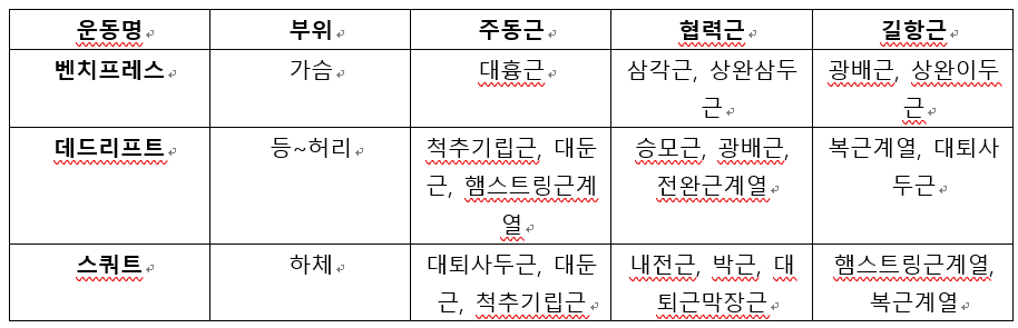 Trainer 뽀빠이: 벤치프레스(bench press), 데드리프트(deadlift), 스쿼트(squat)를 얘기하는 건데, 위의 표를 보면 알 수 있겠지만 이 세 가지 모두 복합관절운동이야. 폭발적인 힘을 내서 근육과 근력을 키우므로 웨이트 트레이닝의 목표에 가장 적합한 운동이어서, 이 세 가지의 중량을 겨루는 스포츠(파워리프팅)가 따로 있을 정도라고.
