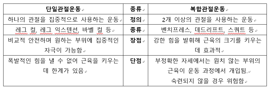 Trainer 뽀빠이: 프리 웨이트 운동은 크게 2가지로 나뉘는데 단일관절운동과 복합관절운동이야.