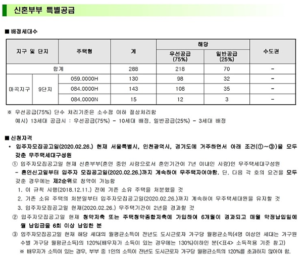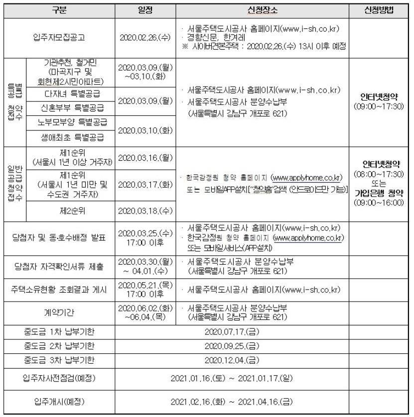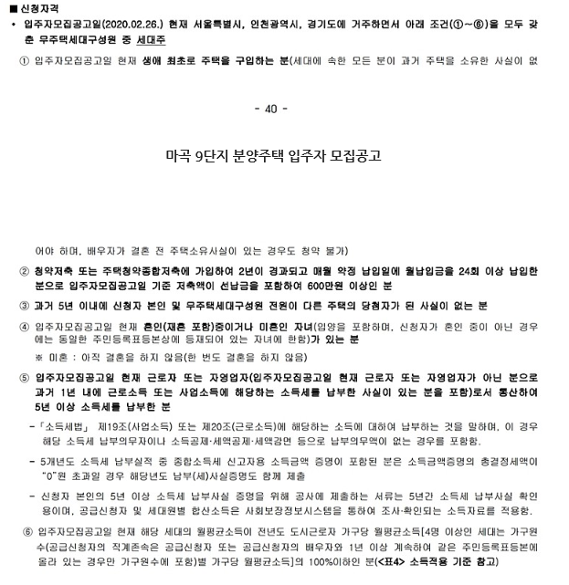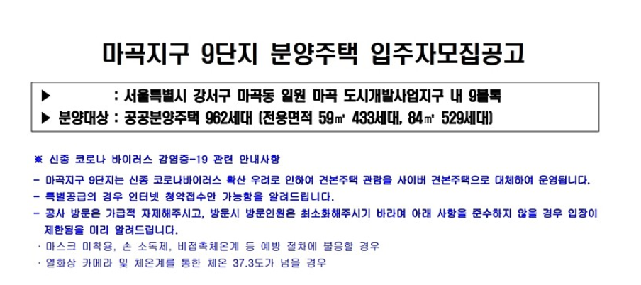 원래 공고 예정일은 2018년 10월이었다. 조금씩 조금씩 미뤄지더니, 오늘에야 이르렀다. 2020년 2월 26일. 나는 이미 신혼기간이 그 때 지나있었지만, 마곡 분양을 기다리느라 항동 등을 패스 했던 분들은 연기 소식에 많은 눈물을 흘리셨을지도 모른다. 나도 생애최초 전형을 위해 소득 100%를 맞추는 행동, 즉 돈을 벌지 않기로 선택하는 행동을 하고 기다렸다면 피눈물을 흘렸을지도 모른다. 참, 마곡에 대한 나의 사랑은 이쯤으로 충분 한 것 같으니 공고문을 훑어보고자 한다.