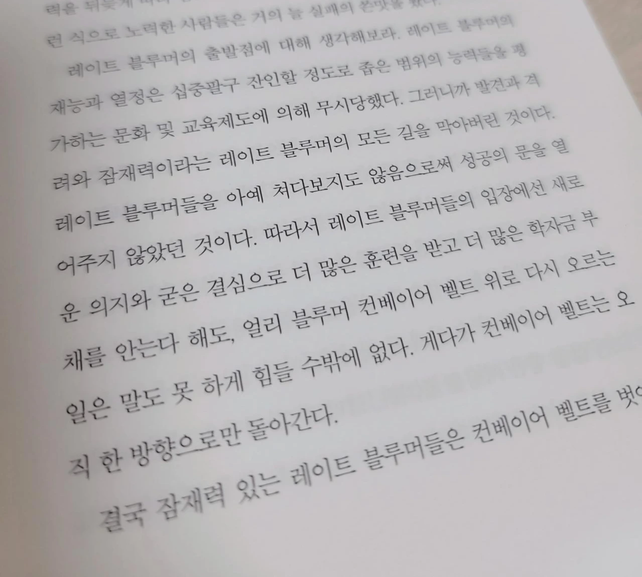 "따라서 레이트 블루머(늦게 잠재력을 펼치는 사람들)들의 입장에선 새로운 의지와 굳은 결심으로 더 많은 훈련을 받고 더 많은 학자금 부채를 안는다 해도, 얼리 블루머(레이트 블루머의 반대말) 컨베이어 벨트 위로 다시 오르는 일은 말도 못 하게 힘들 수밖에 없다. 게다가 컨베이어 벨트는 오직 한 방향으로만 돌아간다. "