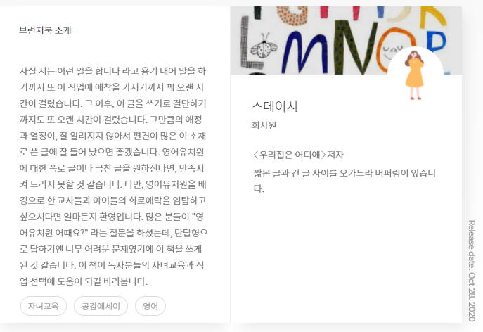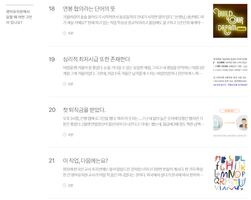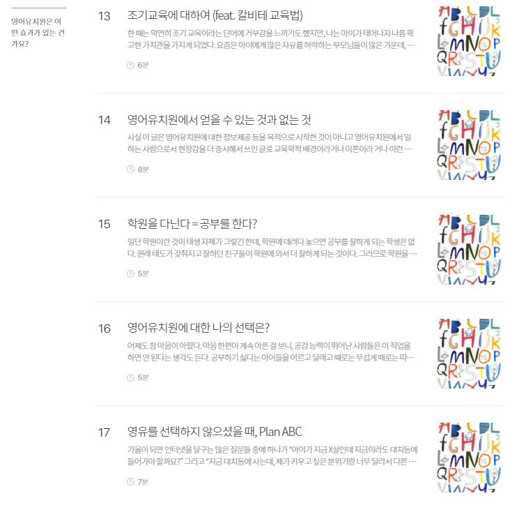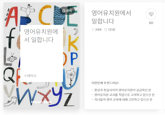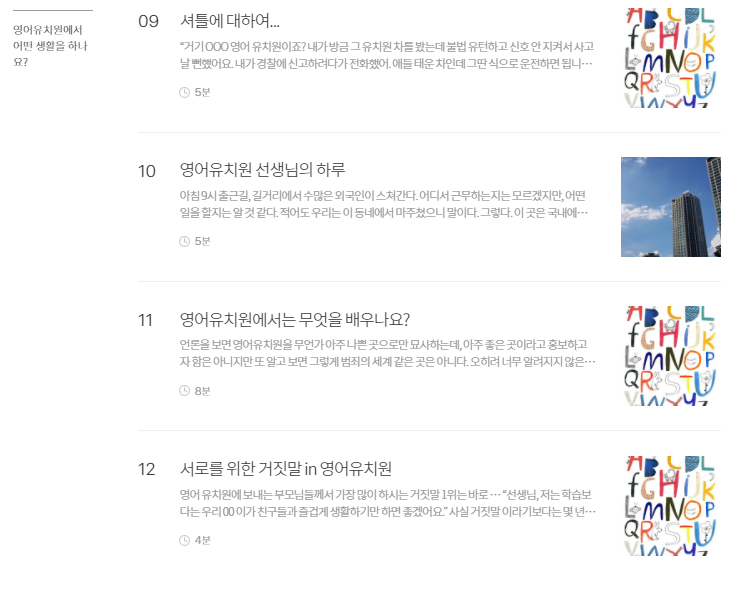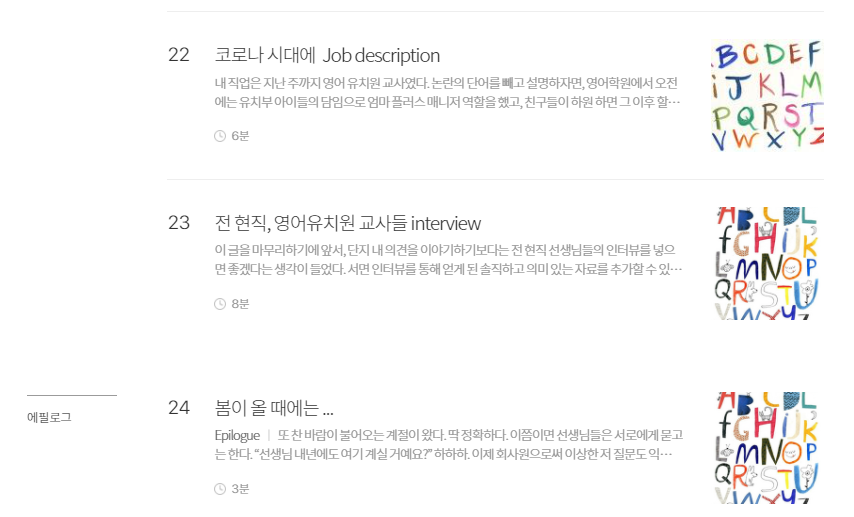 [이 원고는 2020년 브런치 공모전을 준비하여 발표한 글입니다. 물론 이 글에 대한 준비는 2018년부터이니 초고를 쓴 것에만 3년이 걸린 글이고, 현재 제가 이 직업에서 엑시트 한 후 다시 글을 다듬은 시점은 2022년이니 5년은 묵은 김치 같은 원고라고 생각해주시면 감사하겠습니다. 영어유치원에서 스펙터클한 시간을 보냈습니다. 이 직업을 시작한 지 4개월 만에 실장으로 발탁되고, 여러 곳에서 4년을 보내며 마지막 해에는 교수부장으로 이 직업을 종료했습니다. 저는 이 직업에 진심이었던 직업인이기도 했지만, 이 나이 또래 아이를 키우는 워킹맘이기도 했기에 누구보다 영어유치원에 대한 우려와 갈망의 그 안에서 중심을 잡기 위해 애썼다고 말하고 싶습니다. 원고를 작성할 때는 현업에 있었기 때문에 현업에 계시는 분들에게 피해가 가지 않았으면 하는 마음에서 최대한 중립적으로 원고를 쓰고자 애썼습니다. 지금은 한결 가벼운 마음으로 다시 글을 돌아볼 수 있게 되어 기쁘며, 조금 더 솔직하게 마지막 장을 채워보려 합니다. 조금 더 솔직하자면 사실 이 원고는 출간 계약까지 됐던 원고이며 정상적이었다면 2022년 여름 책으로 찾아 뵐 예정이었습니다. 다만, 복잡한 사정으로 계약을 파기해야 했던 아픈 손가락 같은 책입니다. 저는 이 책이 많은 분들에게 위로가 되는 책이 되었으면 했습니다. 영어유치원에 다니는 친구들도, 다니지 않는 친구들도 누군가의 소중한 자녀이며, 한 가지 더 영어유치원에서 일하시는 분들도 누군가의 소중한 자녀입니다. 이와 같은 히스토리를 알고 이 글을 가볍게 읽어주지 않으실 분들만 독자로 모시고 싶습니다.
