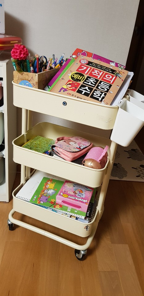 아이 당 하나 씩 자기만의 카트가 있어서 공부할 때는 책상 옆으로 끌고 왔다가 제자리에 가져다 놓는다. 학습지를 책장에 꽂아놓으면 뭐가 있는지도 기억이 잘 안 나고, 잘하지 않게 되는 것 같아서, 매일 하는 것들을 보이게 카트 위에 올려놓았더니 자신이 찾아서 하게 되었다. 카트를 끌고 다니는 재미는 덤이고 말이다.