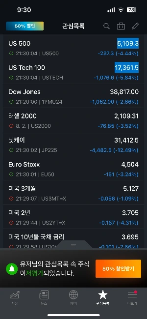 오후 9시 30분 제 인베스팅 앱 화면입니다.