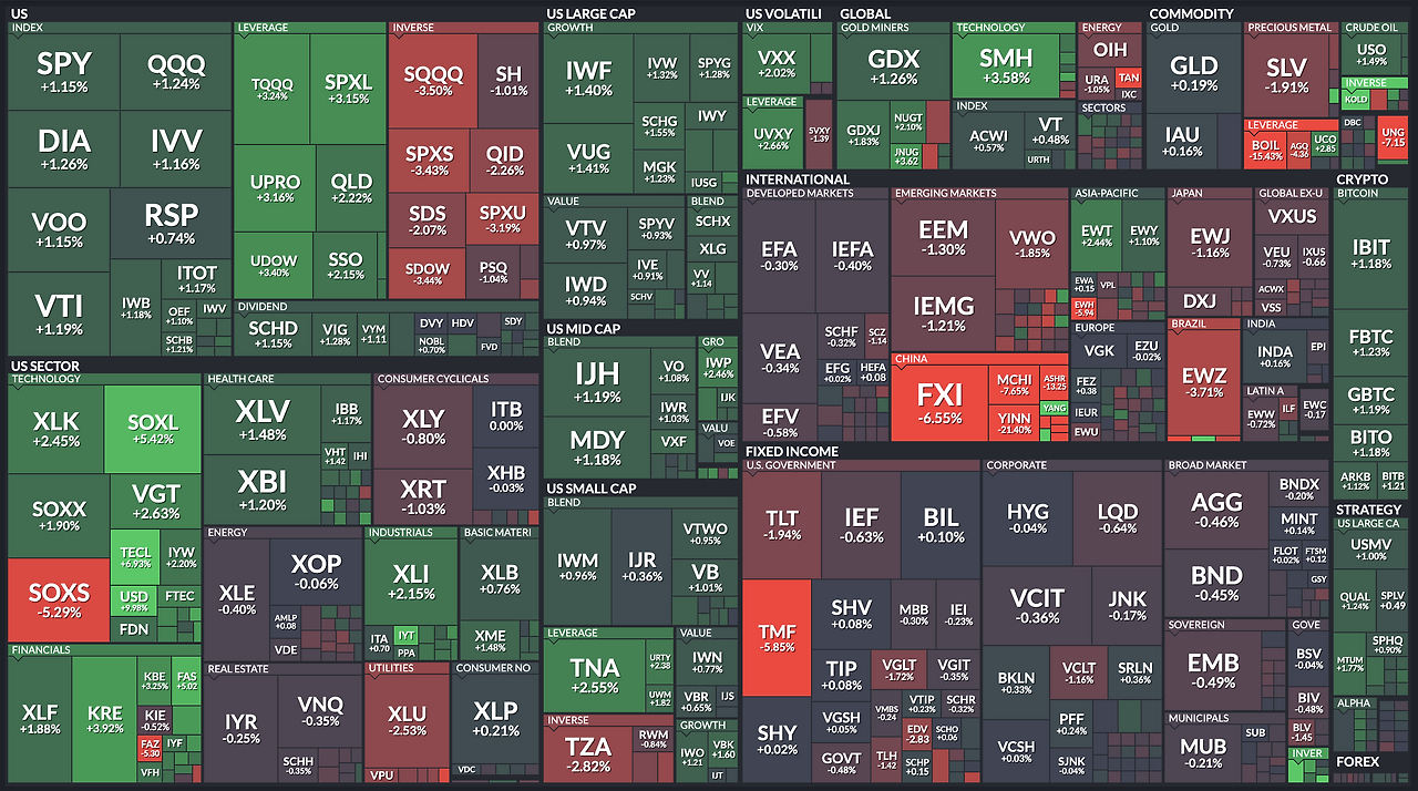 - 엔비디아와 관련주가 상승하면서 반도체 etf SMH와 레버리지 etf SOXL 등 상대적으로 퍼포먼스가 좋습니다. 또한 엔비디아 비중이 10% 이상 담긴 XLK, VGT 성과도 좋습니다.