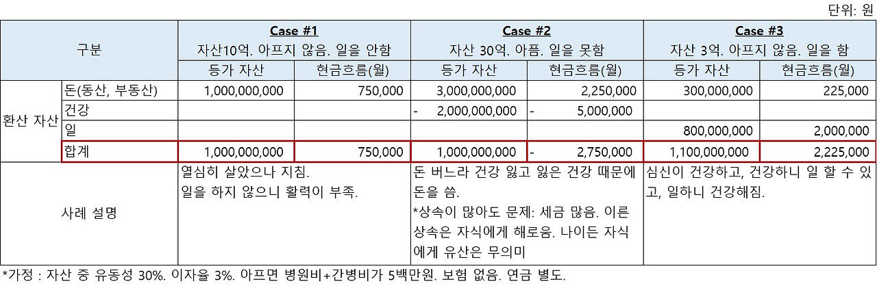 내친김에 '돈 + 일 + 건강'을 총자산으로 잡고 간단한 시뮬레이션을 해봤다. 통장, 서류의 숫자가 다가 아니다. 현혹되지 말자.